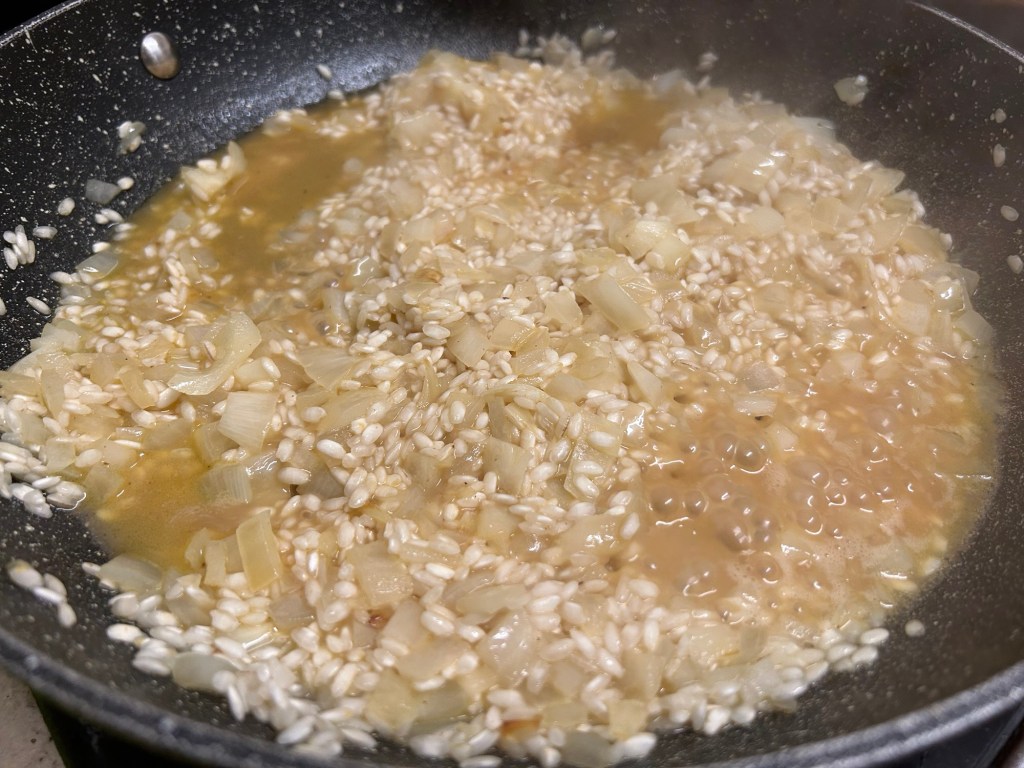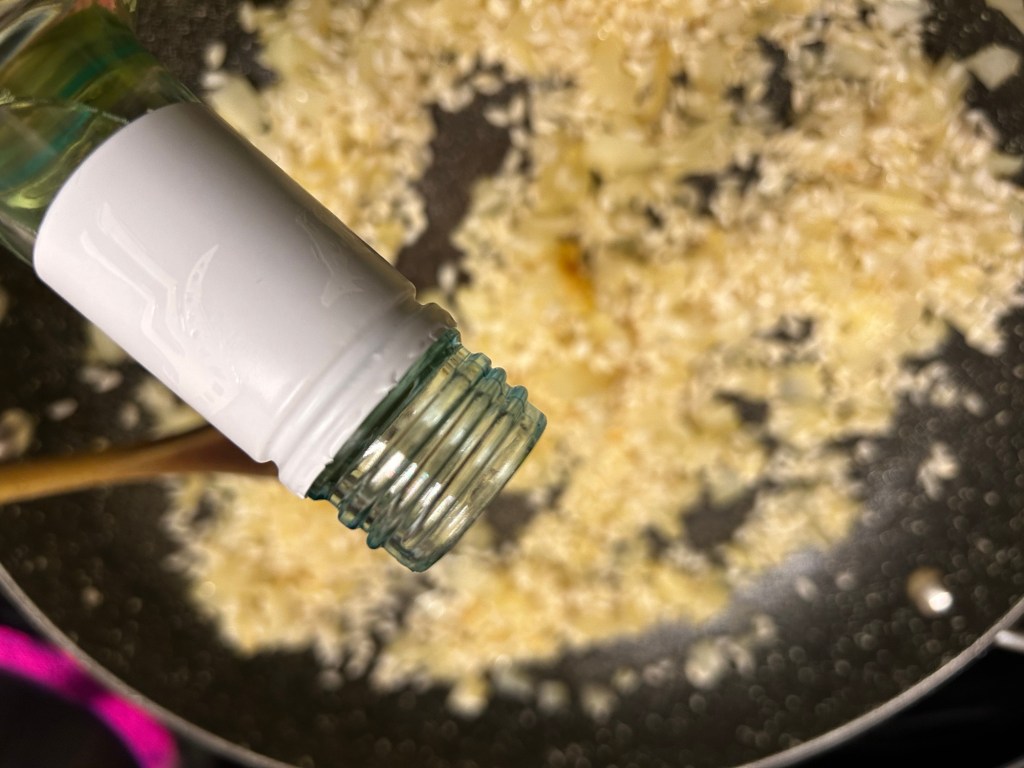 You then want to cook out the wine so you have none left in the pan as you want the rice to absorb it. This should take about 5 minutes or so depending on how generous you were with the wine 👍