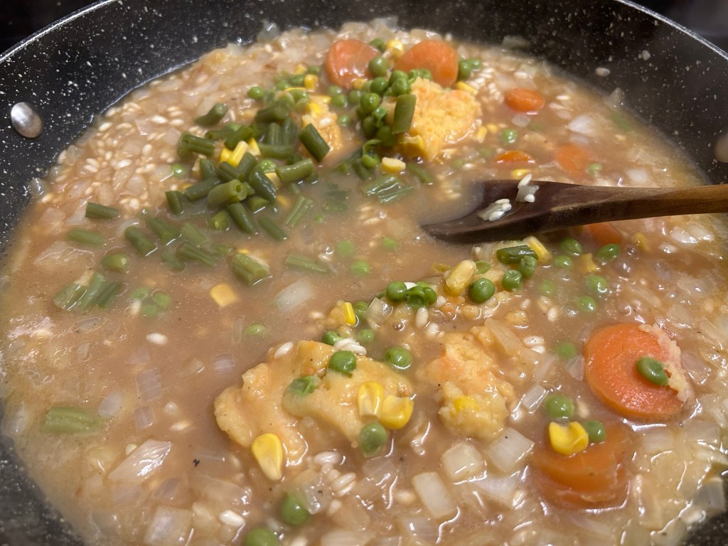 Whilst the rice was cooking the stock was being reduced I started to build up the layers of flavours. Started with the leftover vegetables.
