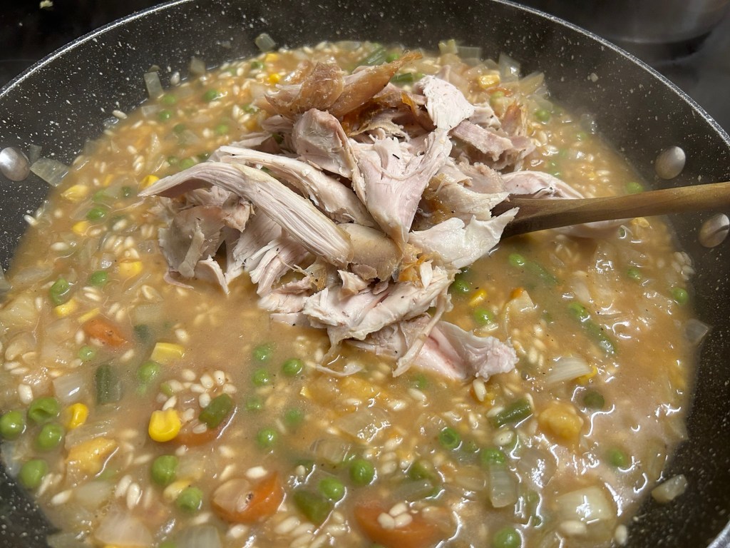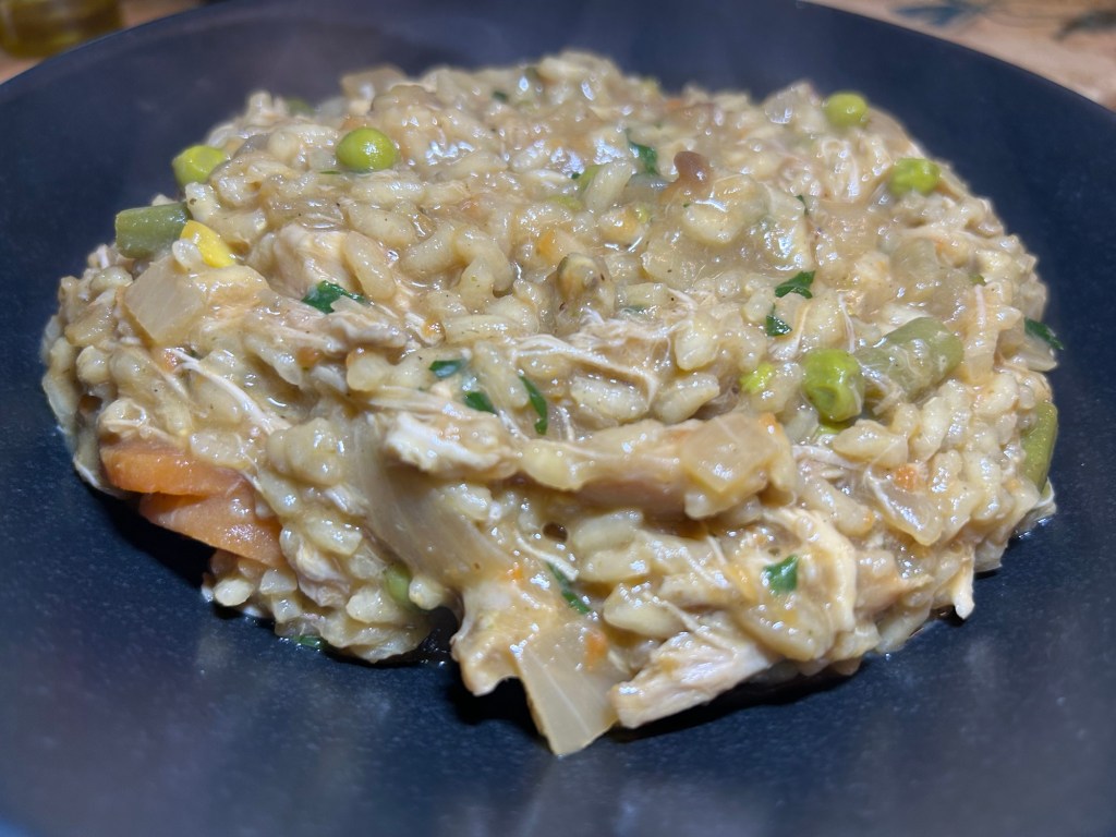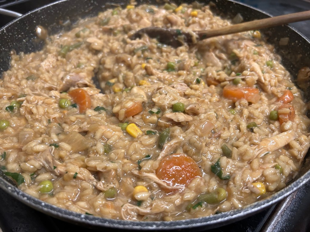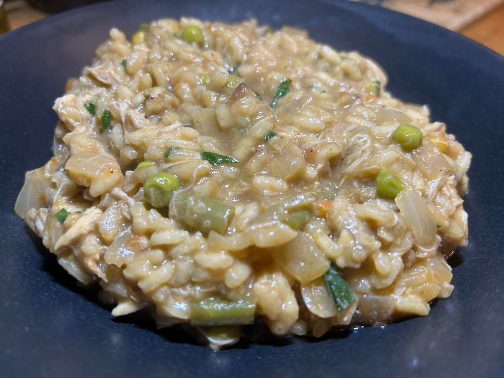 250g or arborio rice, large knob of butter, 1 litre of either chicken or vegetable stock, 1 onion diced, a good glug of white wine, large handful of chopped parsley, large handful of grated Parmesan, plus whatever you want the dish to be focused around, on this occasion my Sunday roast left overs which were – roast chicken, carrots, green beans, peas, sweetcorn, swede mashed potatoes and stuffing for texture. Instead of the stock I used the leftover gravy which was made from the roast chicken juices as again I wanted no wastage.