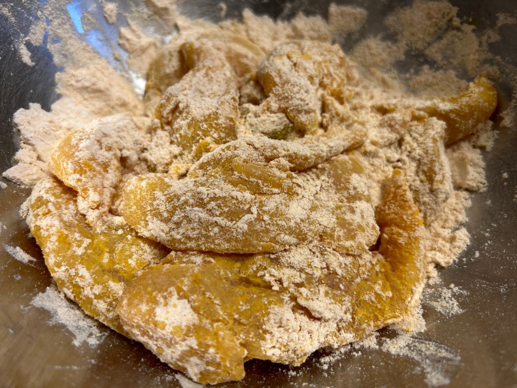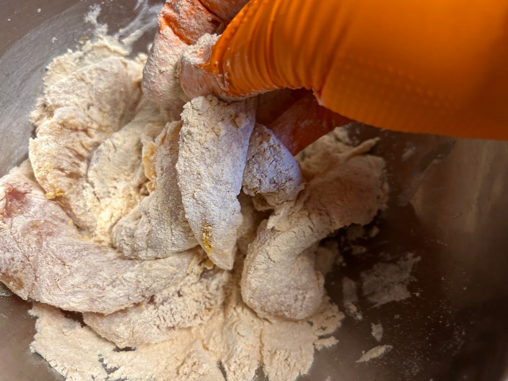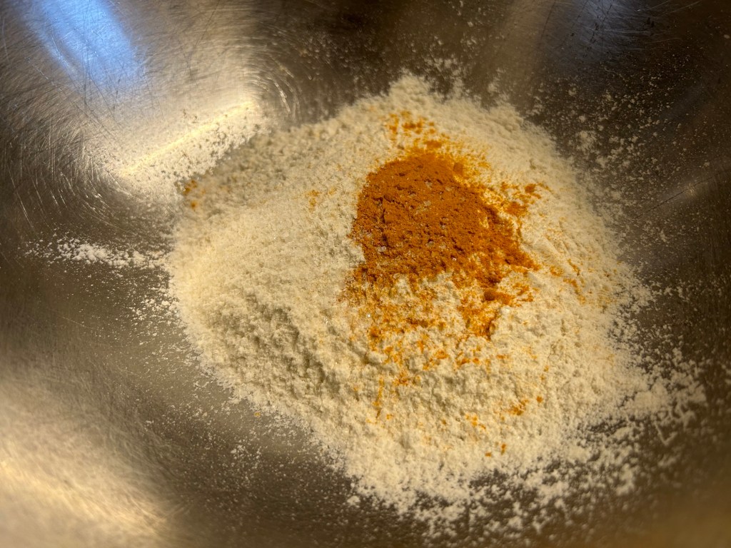 The chicken prep. In a mixing bowl add the flour, turmeric and salt then mix well. You may want to wear gloves to prevent the turmeric staining your hands.