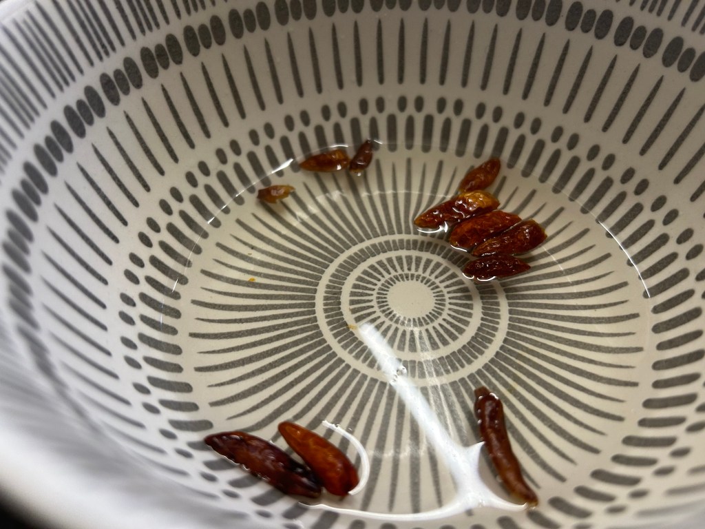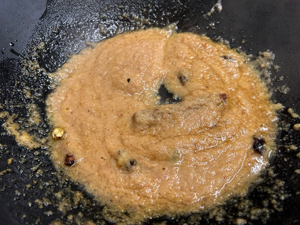 Part 2 – 10 dried chillies soaked in hot water for 10 minutes, 1 red onion finely diced, 2 heaped tbsp of garlic & ginger paste, 1 tsp of galangal, lemon grass stalks (sadly I didn’t have any so I didn’t add them).