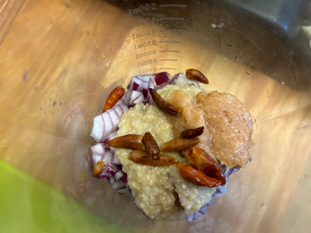 Add them to the chopped red onion, garlic & ginger paste, galangal in a blender.