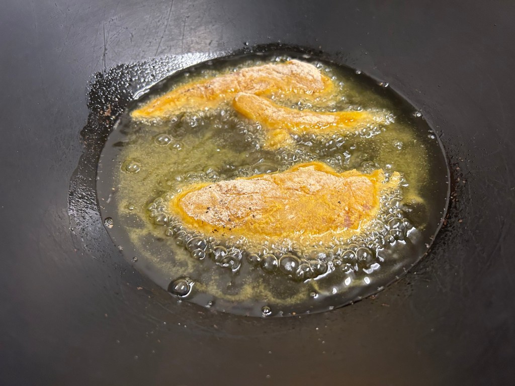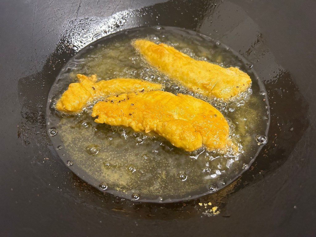 Heat the oil in a heavy based pan. Once the oil is hot and bubbles are forming add your coated chicken and fry in small batches.