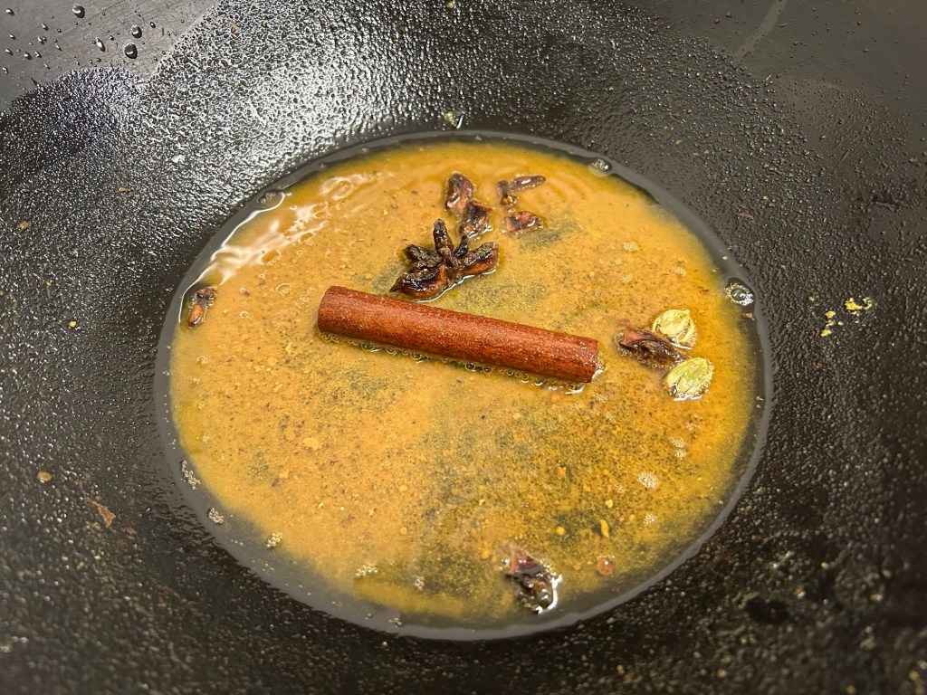 Remove 3/4’s of the oil from your pan. Return the pan to the heat. Add in the whole spices – cardamom, star anise, cinnamon stick and cloves. Swirl these around the hot oil for 30 seconds or so.
