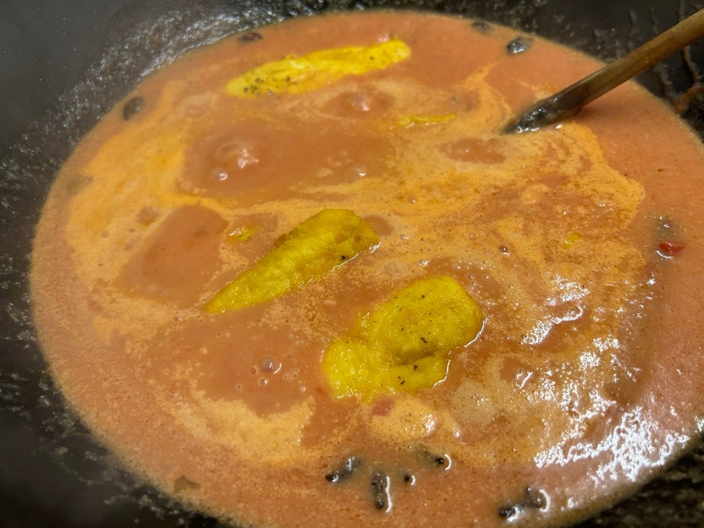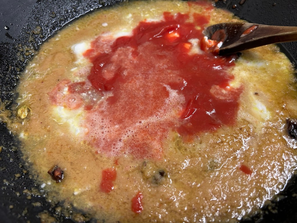 Part 3 – 250ml rapeseed oil, 1 star anise, 1 small cinnamon stick, 2 cardamom pods smashed up, 2 cloves, 400ml of passata, 400ml of coconut milk plus salt and pepper.