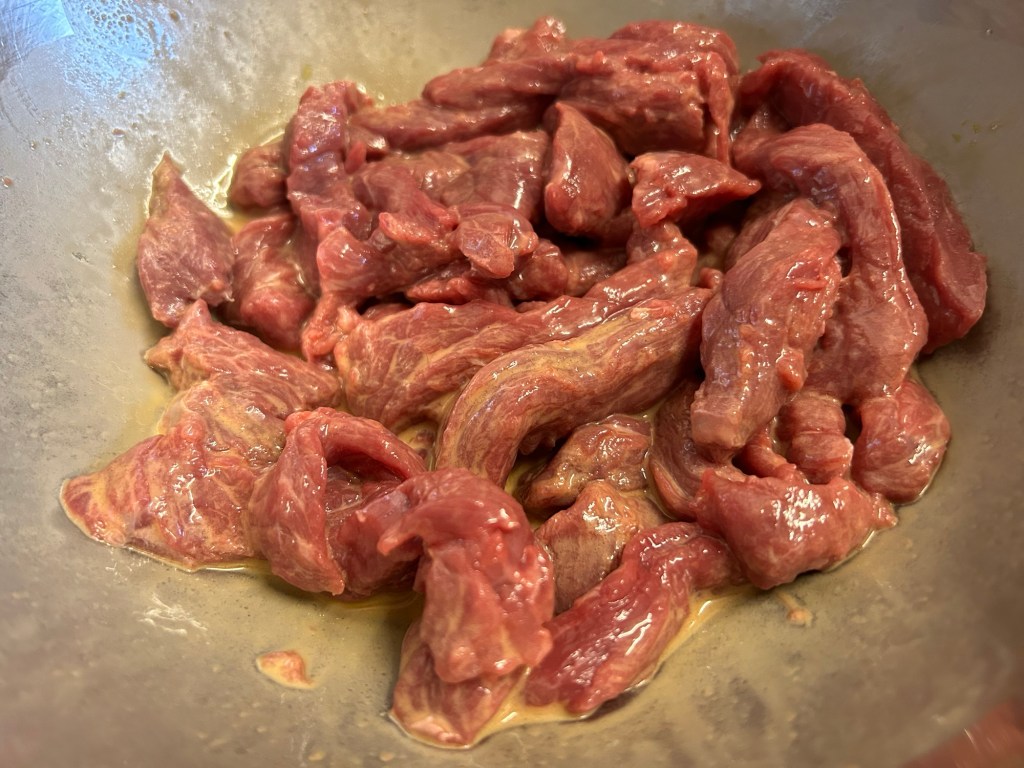 Heat your wok. As the wok starts to smoke add in your groundnut oil and swirl it around the wok. Add in your beef and stir fry it so it’s nice and brown. You might need to do this in a couple of batches as you don’t want to overcrowd your wok.