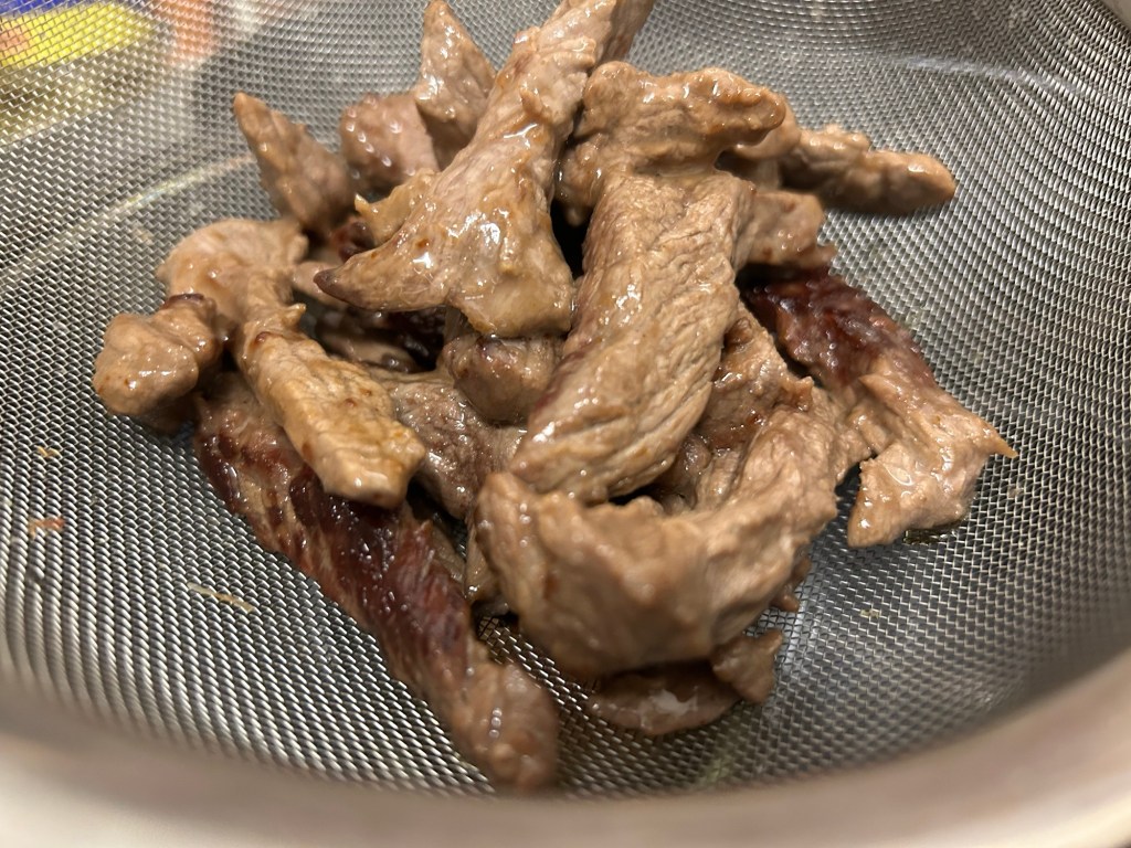 Once your beef is cooked place it in a sieve over a bowl so the juice run out. After you’ve cooked both batches drain the wok of the oil and give it a wipe. Be careful as it will be very hot !!