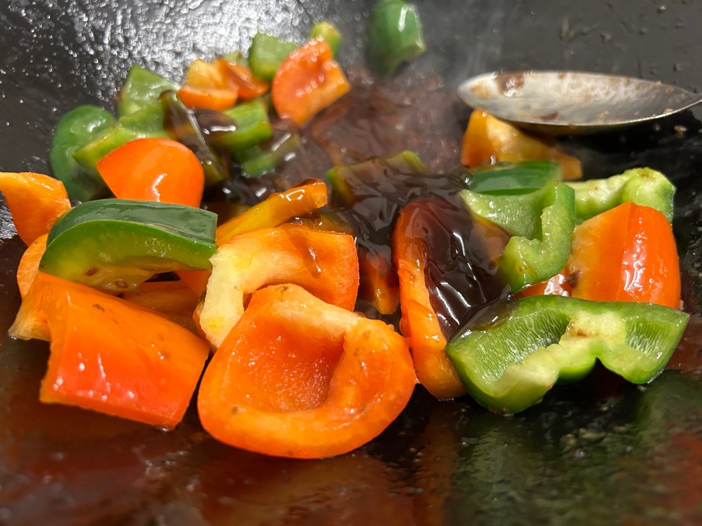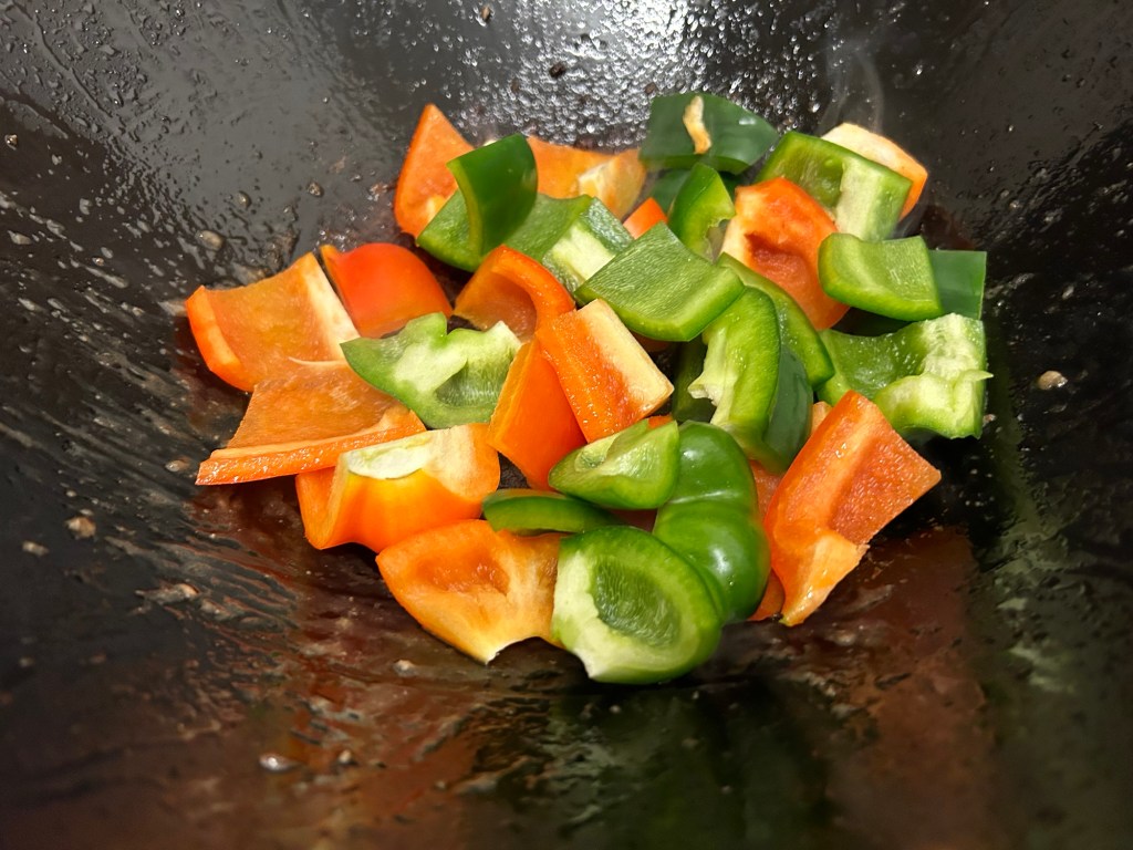 Return your wok to the heat. Add in the peppers and stir fry them. You want to retain the crunch.