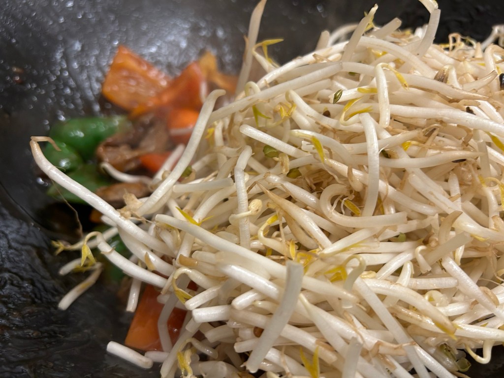 After a minute of stirring I added a bag of shop bought beansprouts and give them a big stir. These only take a couple of minutes to cook.