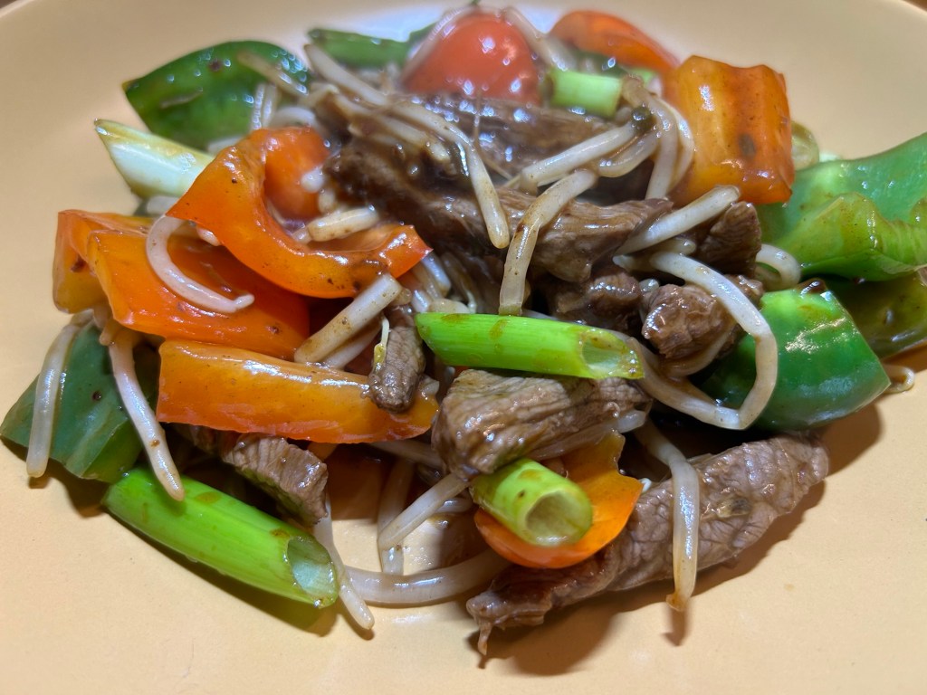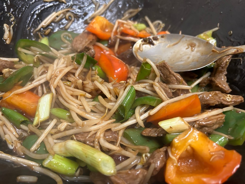 450g (ish) of lean beef cut into strips, 2 tbsp of light soy sauce, 2 tsp of sesame oil, 2 tsp of cornflour, 1 tbsp of rice wine vinegar, 3 tbsp of ground nut oil, 1 red pepper cut into chunks, 1 green pepper cut into chunks, 3 tbsp of oyster sauce, 2/3 spring onions cut into pieces and I added a bag of beansprouts.