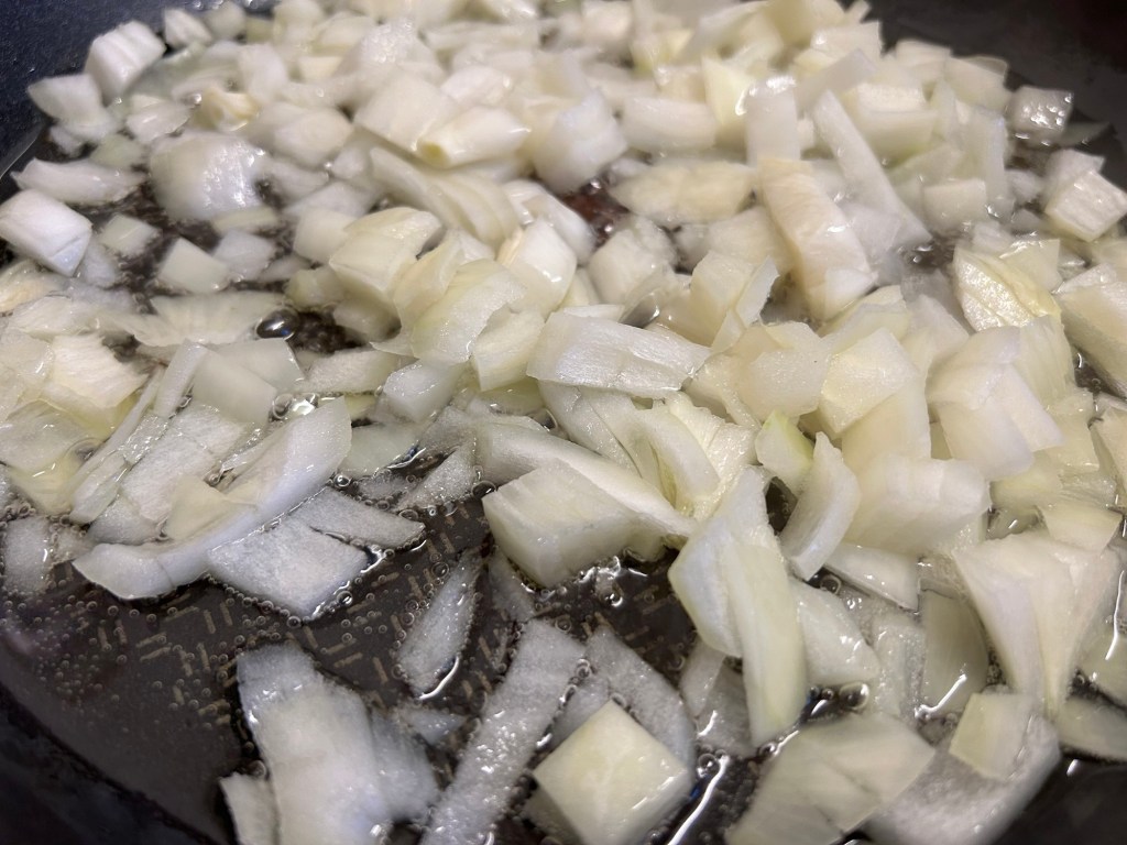 Heat the vegetable oil in a pan. When it’s hot add in your onion and fry this off for 5 minutes until it’s nice and translucent.