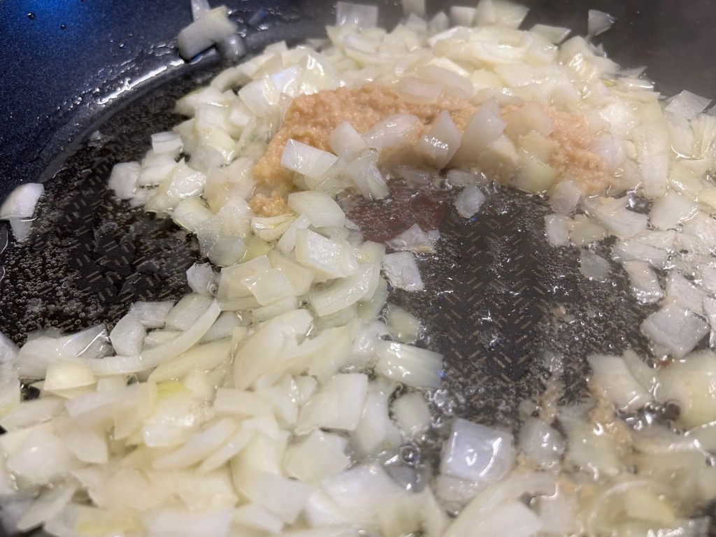 After 5 minutes add in garlic and ginger paste giving it a good swirl around the pan.