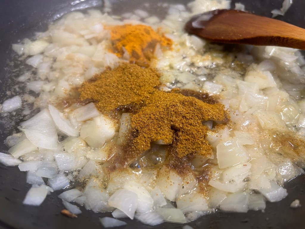 After a minute add your curry powder and turmeric.