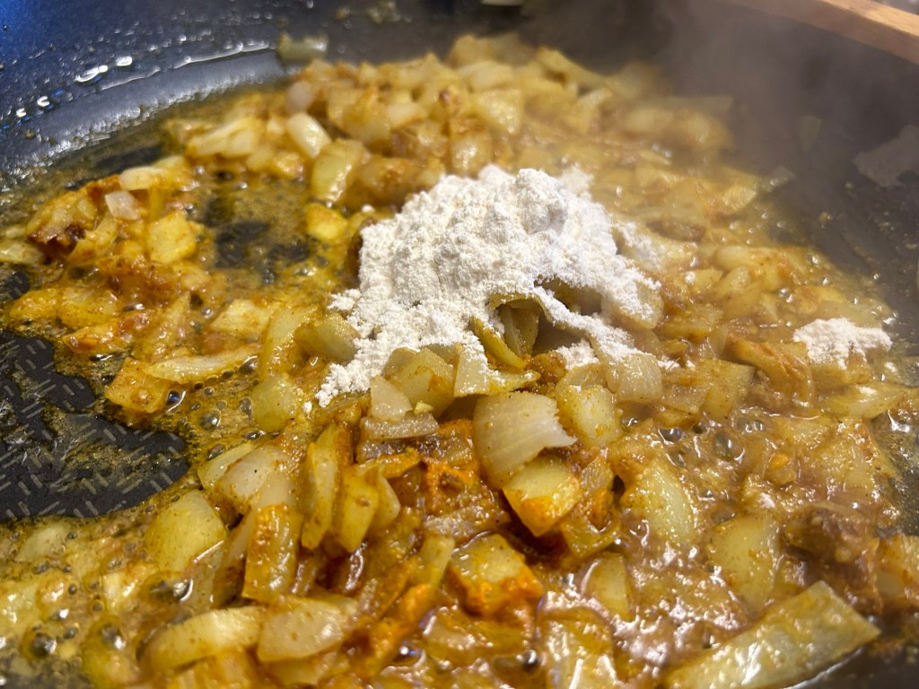 Add the flour, again giving it a good stir. This is your thickening agent. Once you add the stock you’ll see the dish come together.