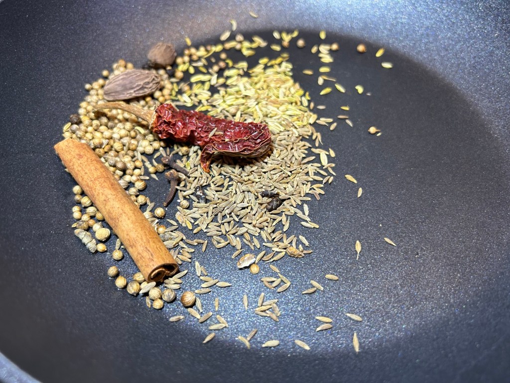 2 black cardamom pods, 1 inch piece of cinnamon stick, 2 cloves, 1/2 tsp of the seeds from green cardamom pods, 1 tsp of cumin seeds, 2 tsp of coriander seeds, 1/2 tsp of fennel seeds, 1 large dried Kashmiri chilli.
