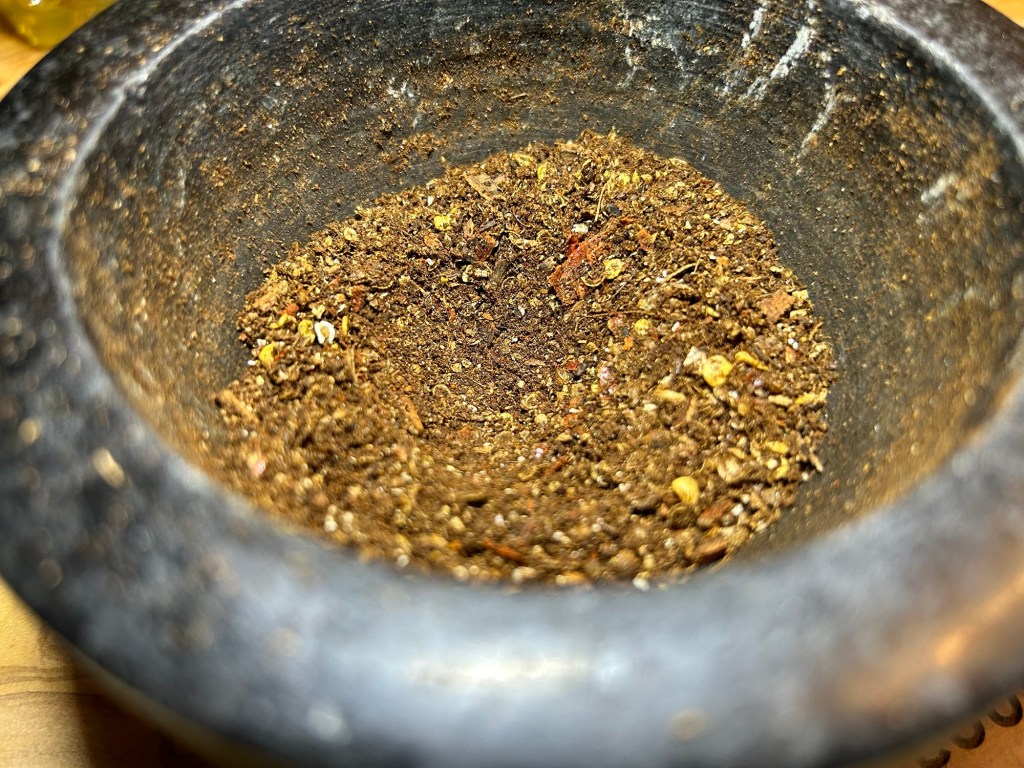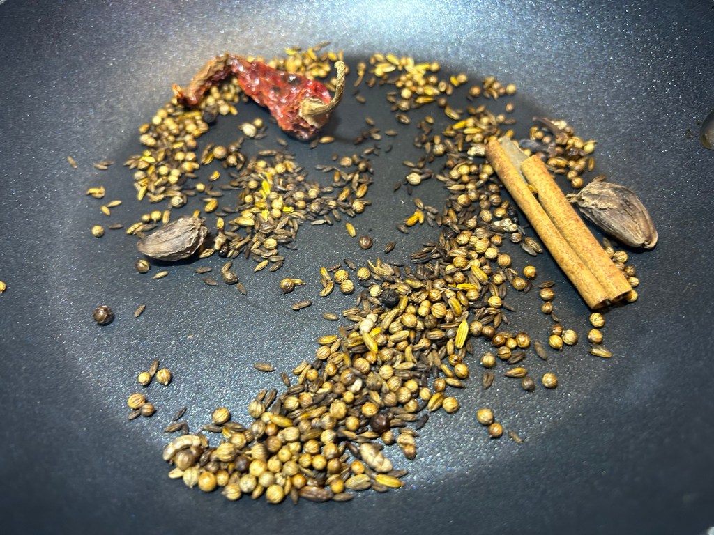 One of the rewarding parts of this dish is making your own spice mix. A simple dry roasting method then grinding the ingredients up in a mortar and pestle.