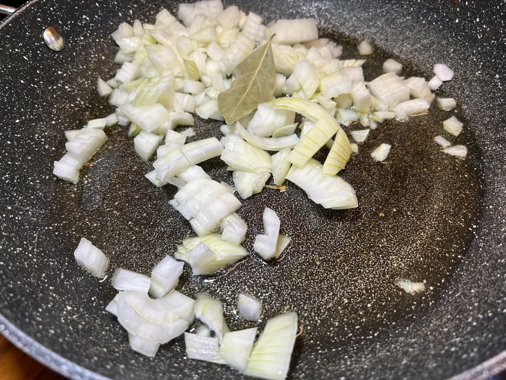 Heat the rapeseed oil in a large pan. Once the oil is hot and has those nice swirls in it added the diced onion and bay leaf. Fry the is off for 8-10 minutes until it starts to brown.
