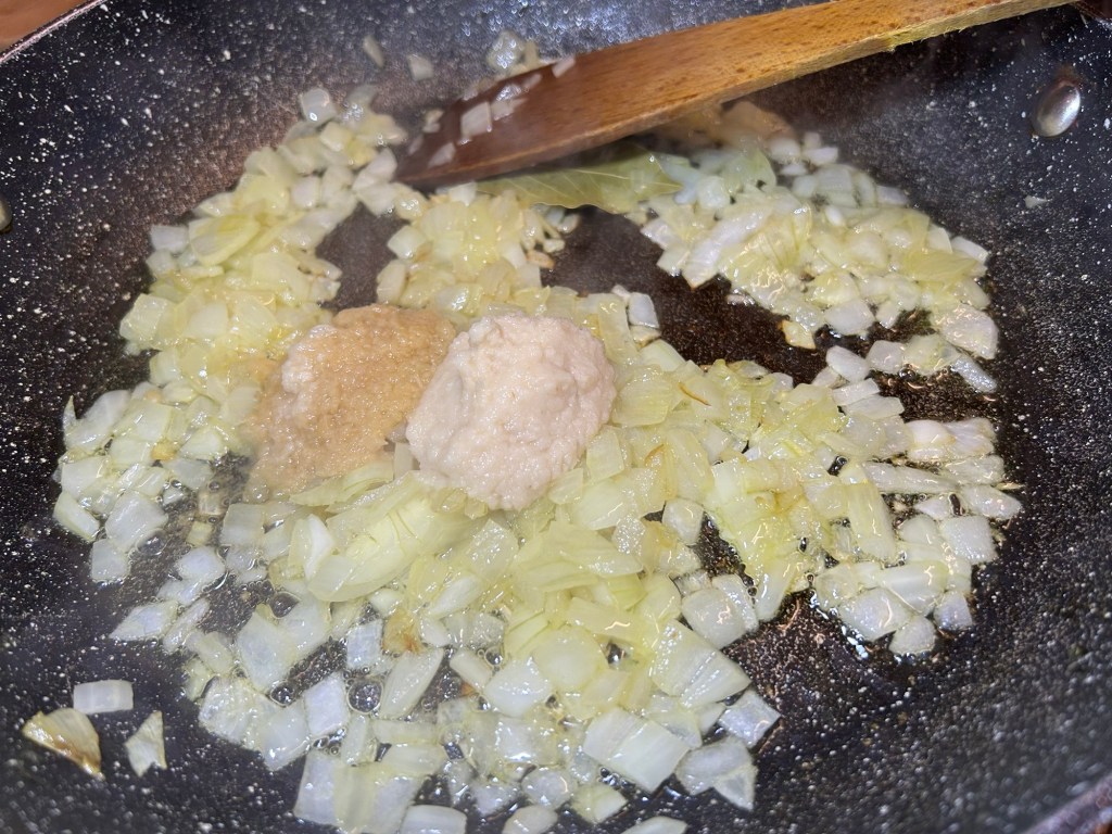 Once your onions have reached the colour you want add in the garlic and ginger pastes. mix the pastes around the pan and allow it to cook out slightly for a minute or so.