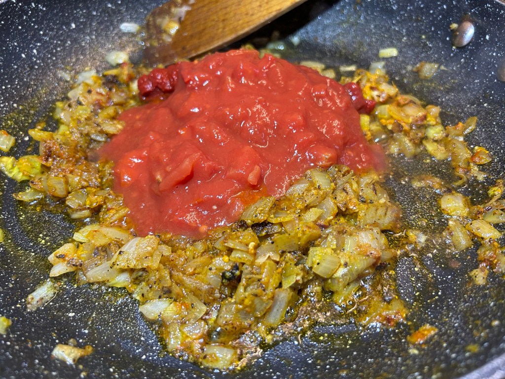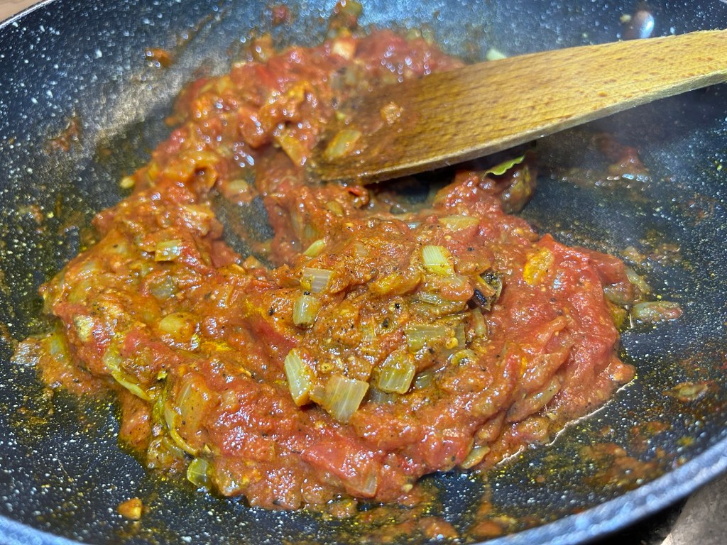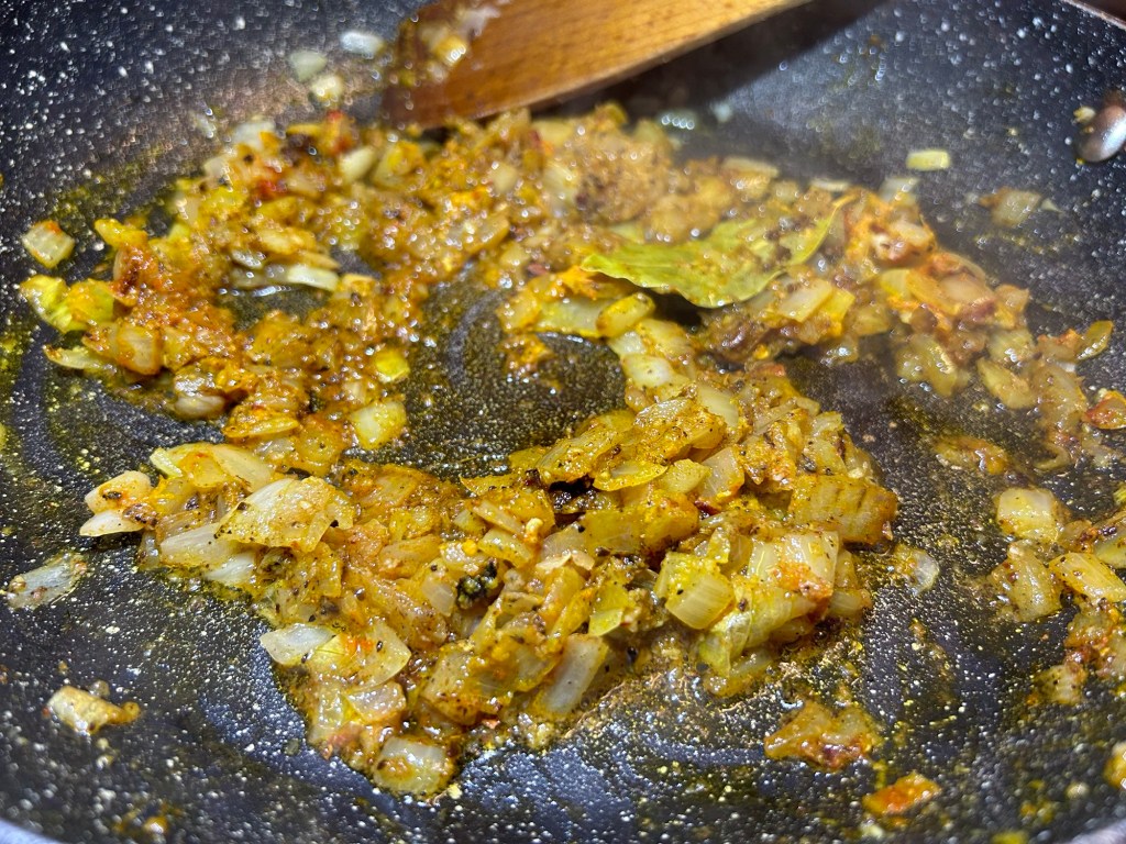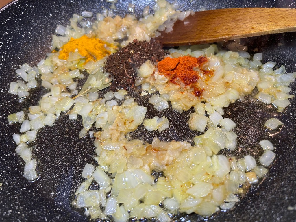 Lower the heat slightly and add the pre-made spice mix, chilli powder & turmeric plus 2 tbsp or so of the warm water to loosen up the spices and prevent it sticking.