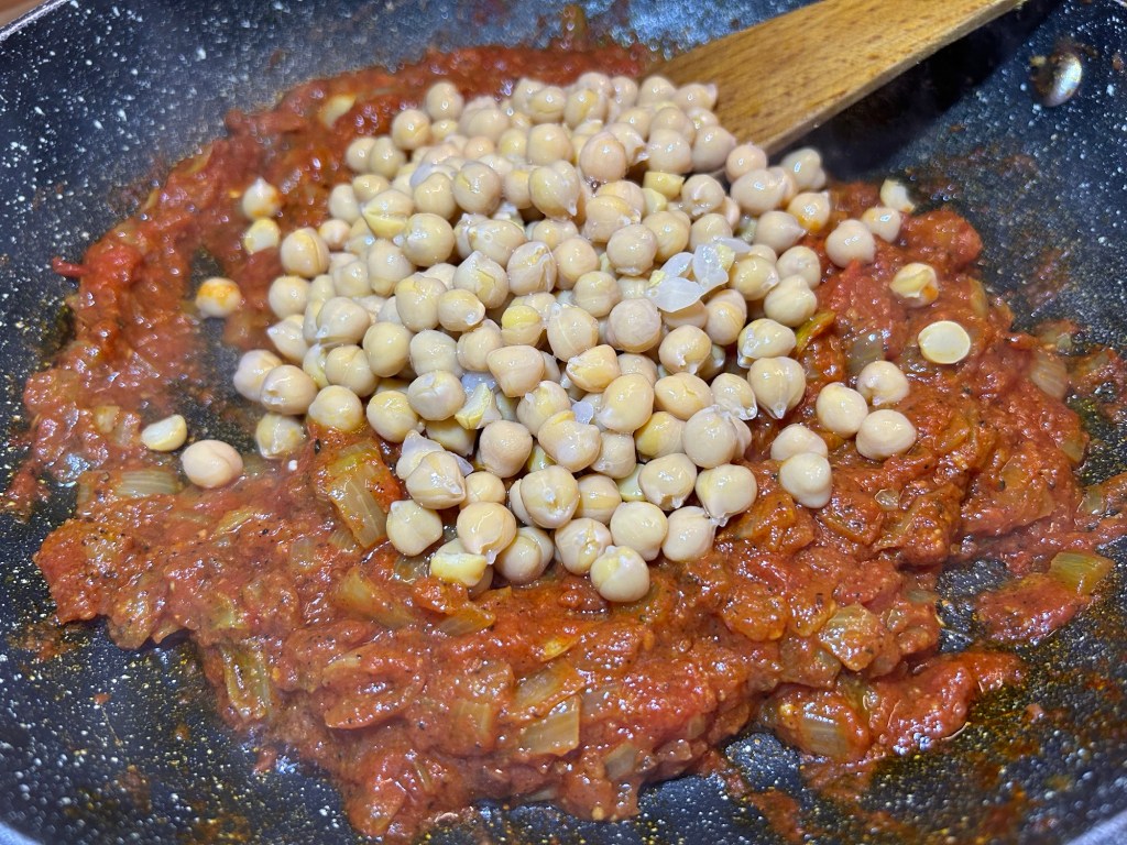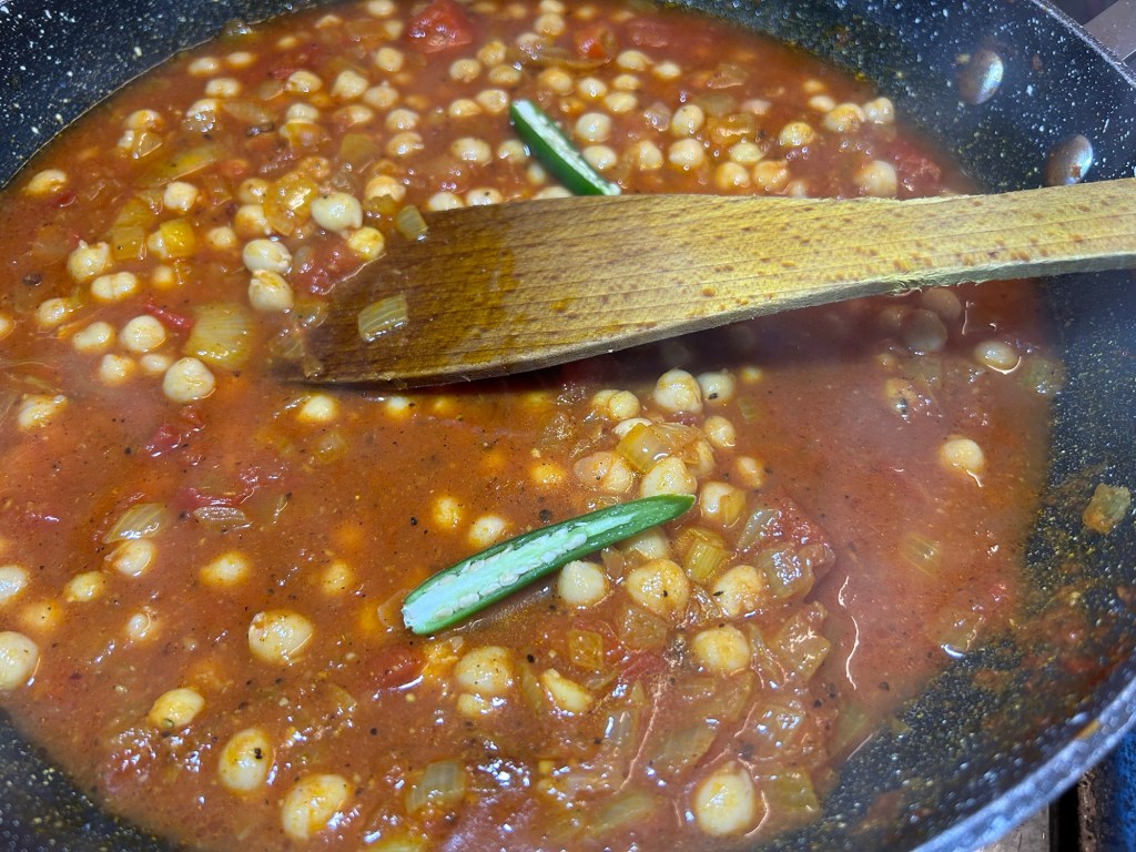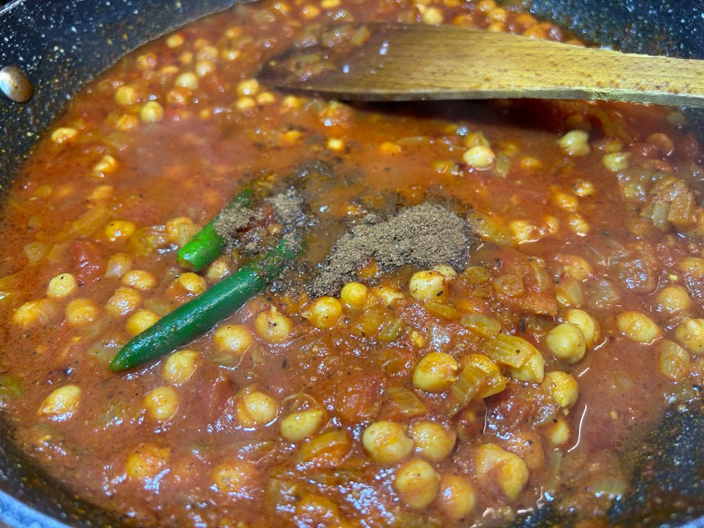 Add the salt, slit green chilli and remaining warm water. Cook the chickpeas in the sauce for 5 minutes.