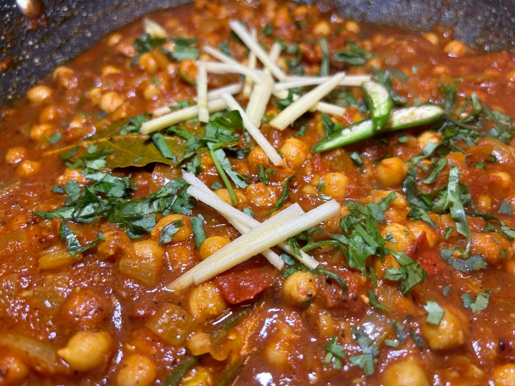3 tbsp of rapeseed oil, 1 onion finely diced, 1 bay leaf, 1 large heaped tbsp of garlic and ginger paste, 2 tsp of the pre-made spice mix, 1 tsp of chilli powder, 1/2 of turmeric powder, 250ml of warm water, 200g of chopped tomatoes, 1 tbsp of tomato purée, 1 tin (400g) of chickpeas, good pinch of salt, 1 green chilli slit for cooking and another for final presentation, juice of 1/2 a lemon, 1 tsp of garam masala,coriander leaves, small piece of ginger julienned for presentation.