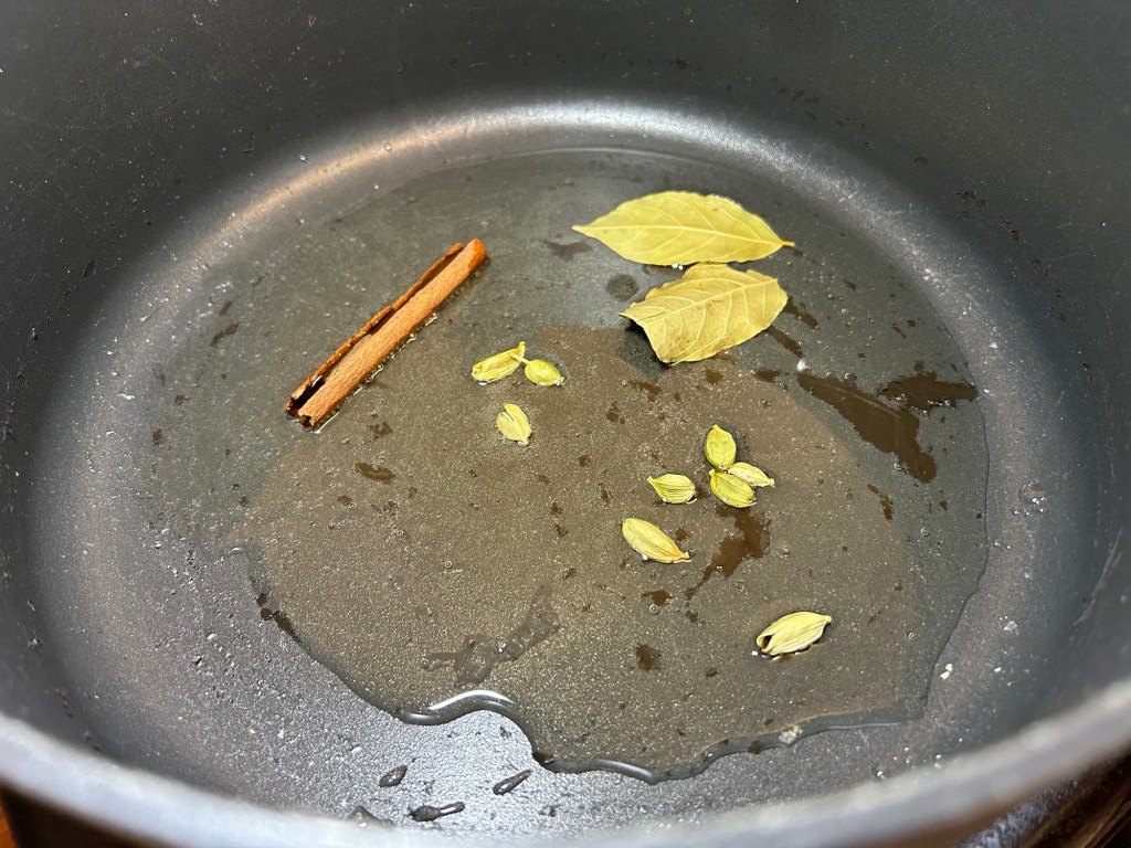 Heat the oil in a heavy based pan. When hot add the cinnamon, bay leaves & cardamom pods letting them sizzle for 10/15 seconds.