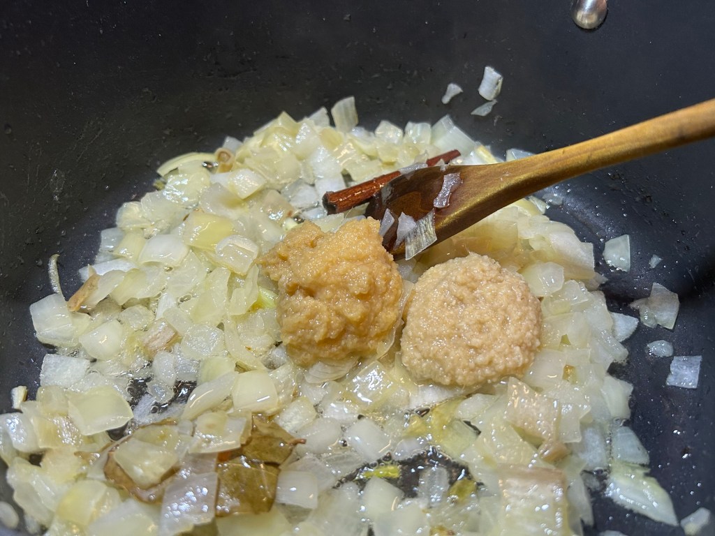 Once the onions have taken on a nice colour add the garlic & ginger stirring them into the onions.