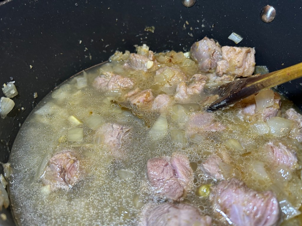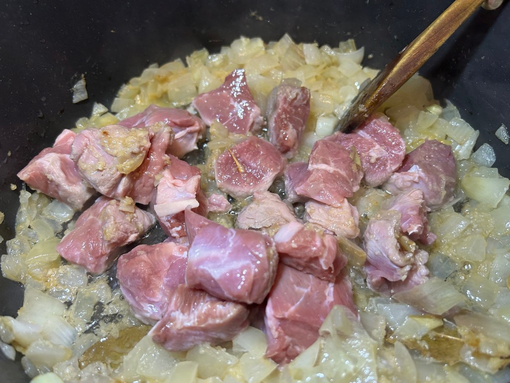 Now add the lamb. Stir the lamb around the pan until it browns slightly.