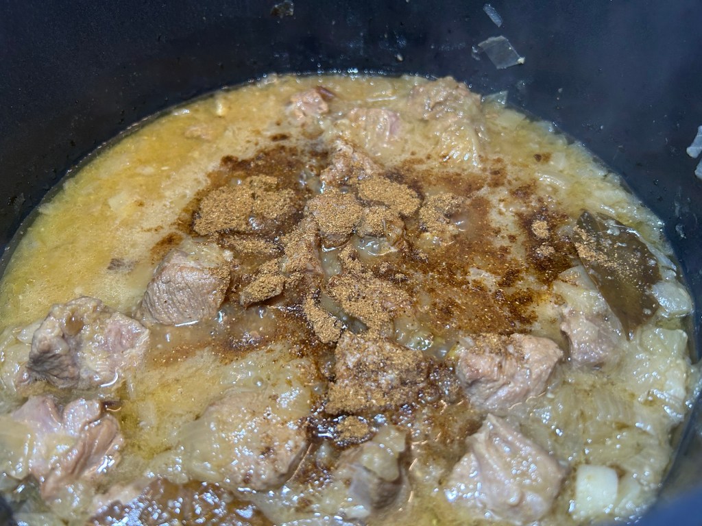 Give the pan a good stir. You are left with a lovely fragrant thick gravy. Bhuna means ‘browned’ or the process of browning. So the meat has browned along with the thick sauce.