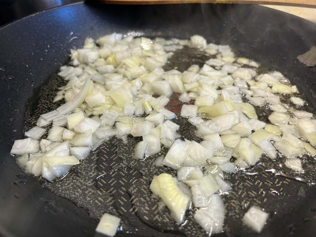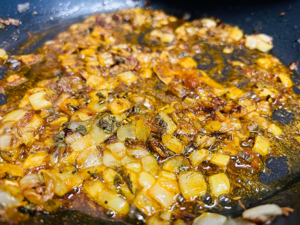 In another pan heat the oil. Once it’s hot add the bay leaves and cumin seeds. Fry these for a minute or so until the cumin seeds sizzle and pop. Add the diced onions and fry for 10/12 minutes until golden brown.
