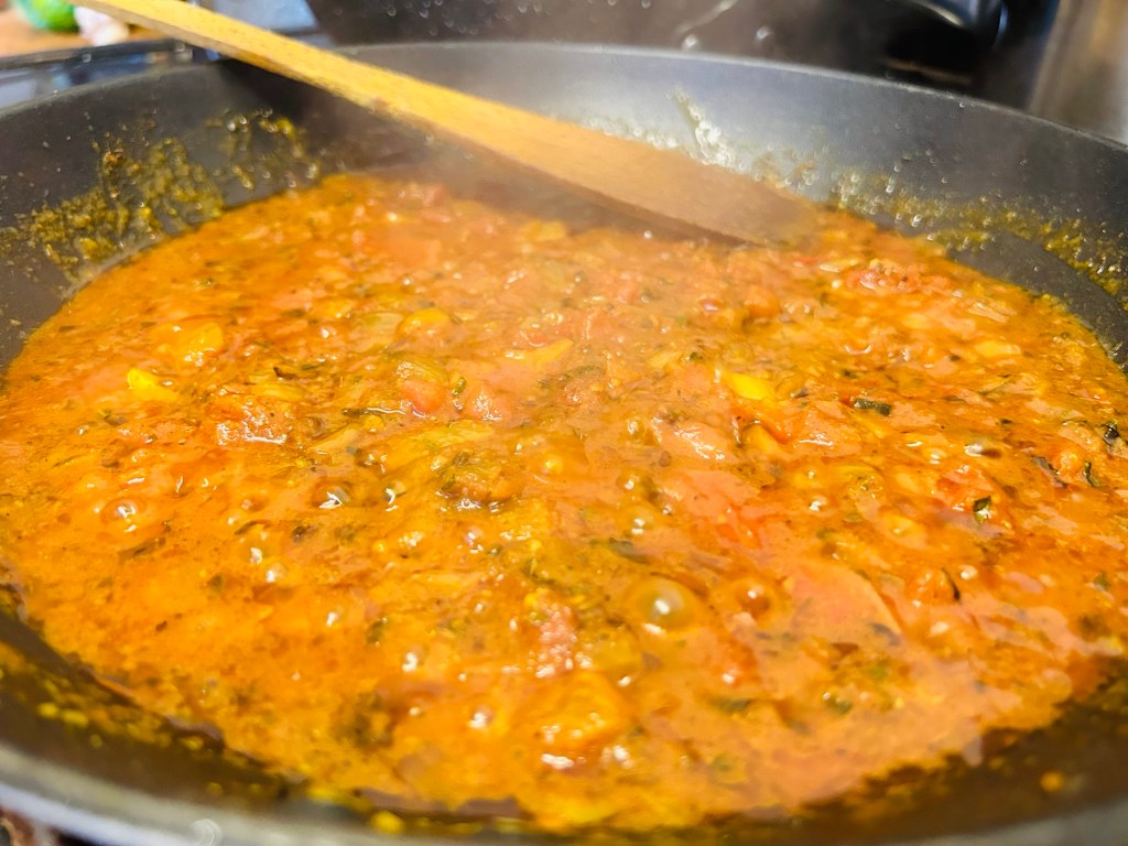 Add the tinned tomatoes, salt and chilli powder. Cook this until the oils start showing at the sides of the pan which will only take a couple of minutes.