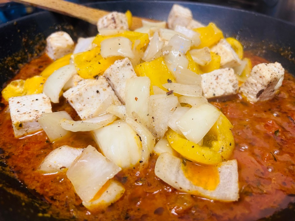 Heat a frying pan, added the paneer which needs to be cut into small cubes, yellow pepper and cubed onions. Add 1/2 tsp of the kadhai masala mix and coat the pan contents. Fry the pan contents for a couple of minutes then put them aside.