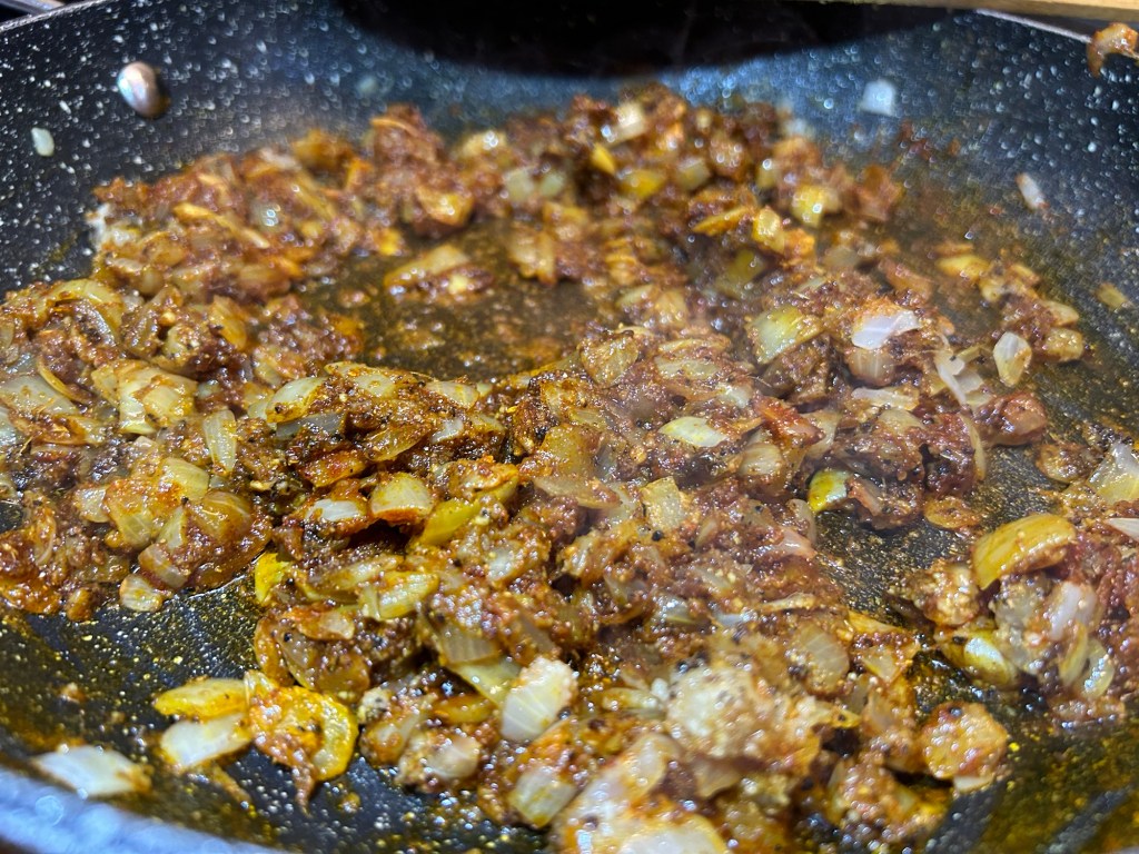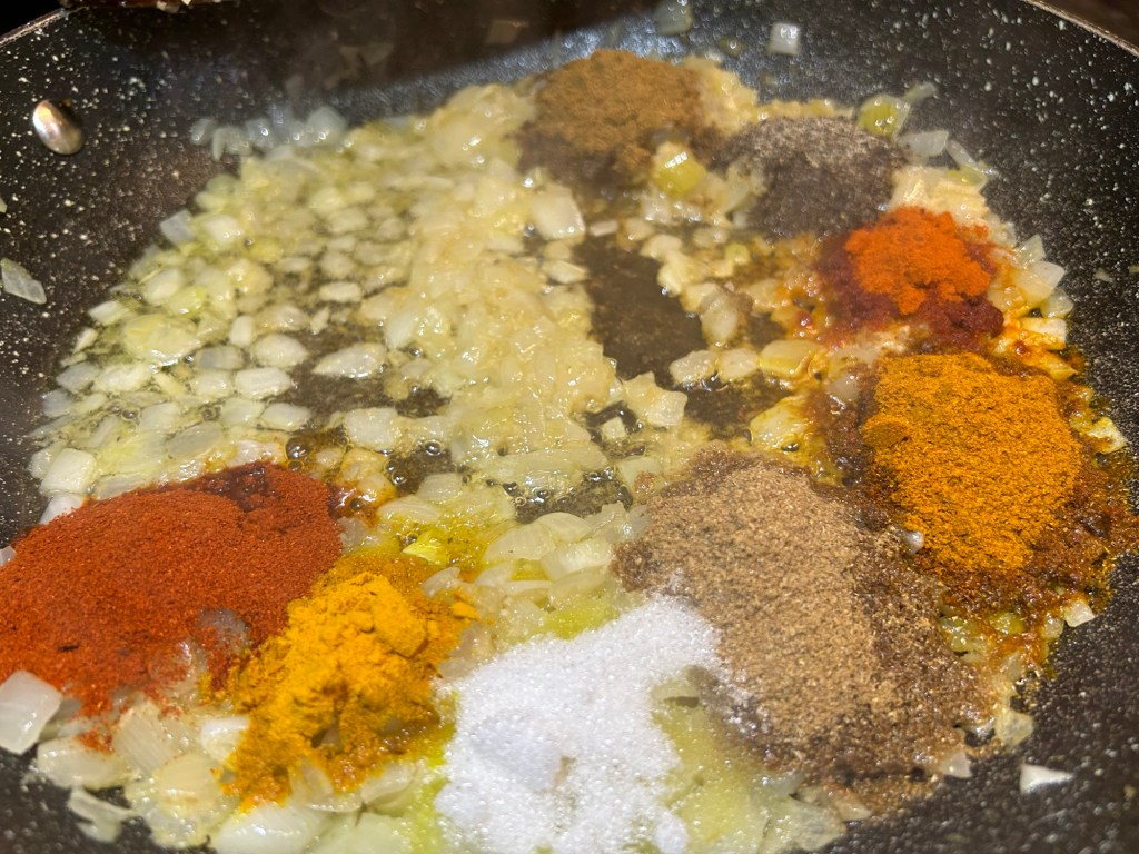 Stir all the spices around the pan to ensure the onion is coated with the dry spices. At this point they will start to add their natural oils to the onion mixture.