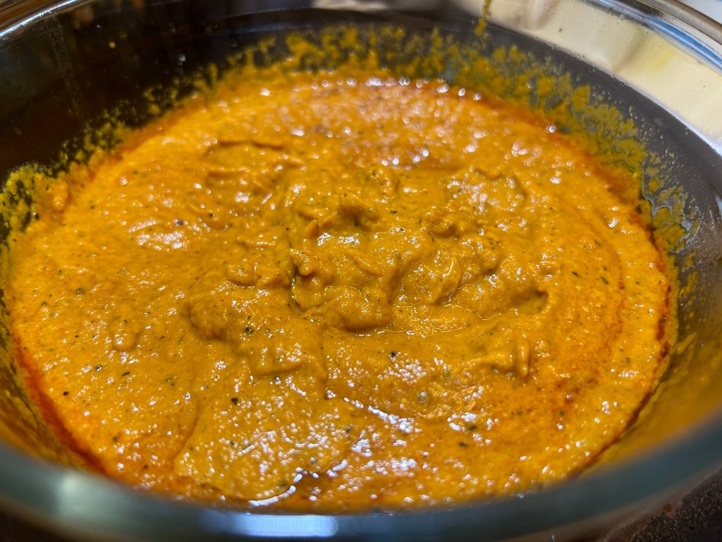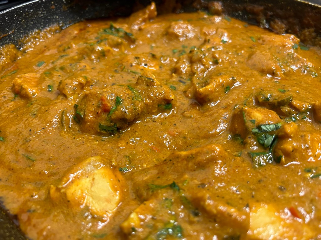 For the sauce – 2 tbsp of rapeseed oil, 2 onions finely diced, 2 tbsp of garlic & ginger paste, 1 tsp of turmeric, 2 tsp of chilli powder, 1 tbsp of ground cumin, 1 tbsp of ground coriander, 1 tsp of paprika, 1 tsp of garam masala, 1 tsp of ground black pepper, 1 tbsp curry powder, 1 tsp of sugar, 200ml of chopped tomatoes (1/2 a tin), 375ml chicken stock.