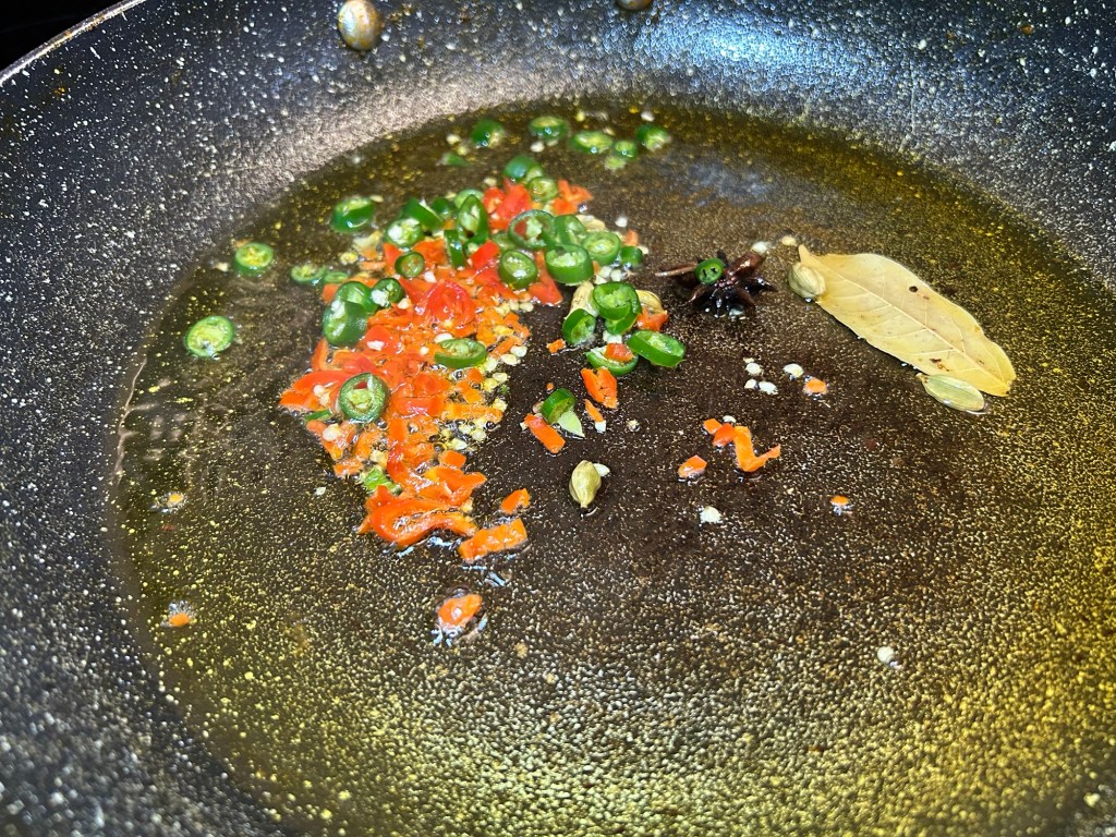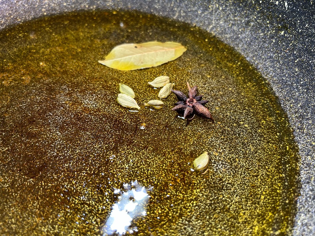 Wipe the pan clean. Return it the heat and add some more rapeseed oil. Once its come to the heat add in the whole spices – cardamom pods, bay leaf and star anise. Allow these to sizzle in the oil for 30 seconds or so.