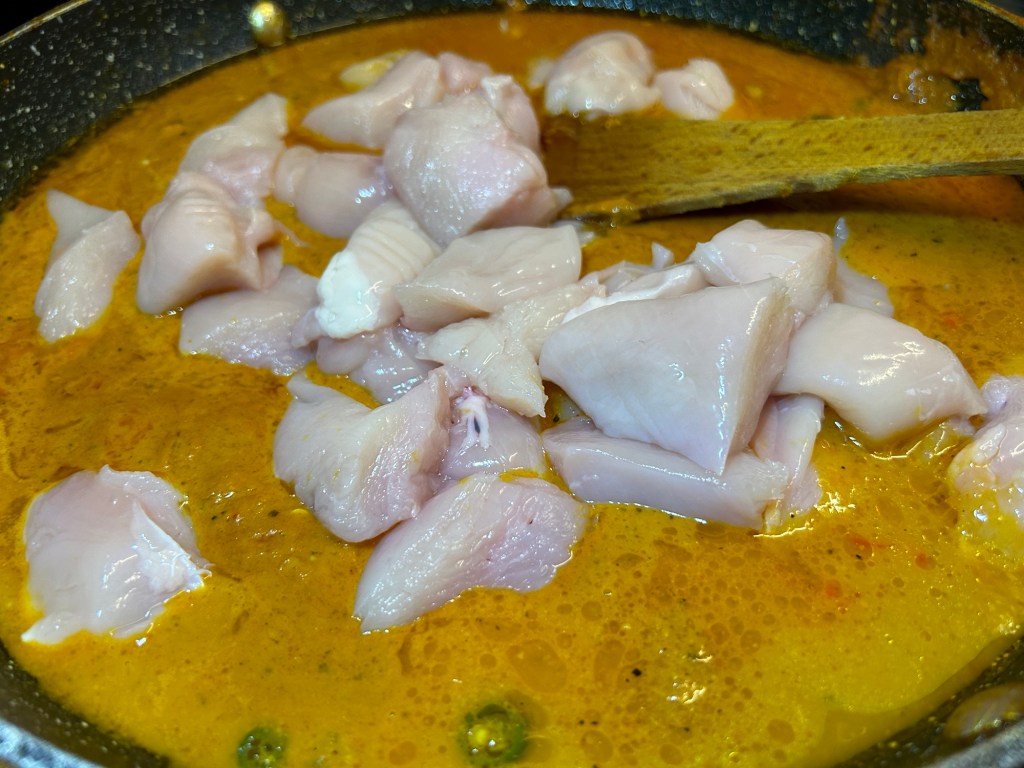 Once the sauce is simmering add in the diced chicken. Cook until the chicken is cooked all the way through which should take about 8 minutes or so.