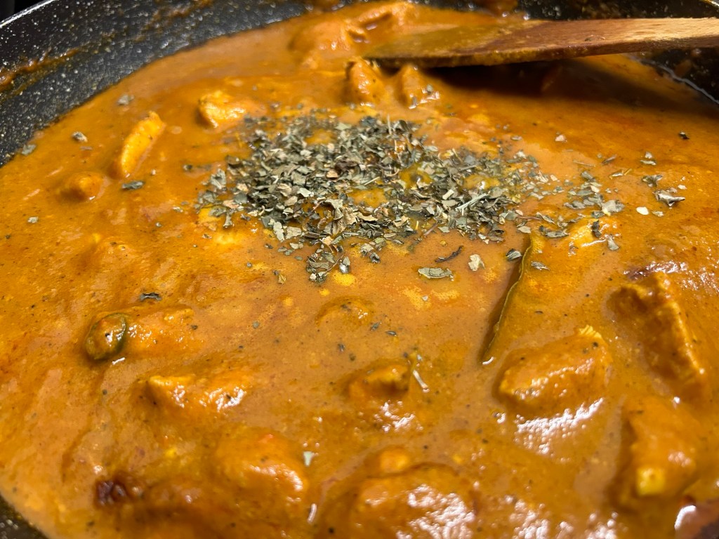 Add in the distilled white vinegar and dried fenugreek leaves giving the pan a good stir.