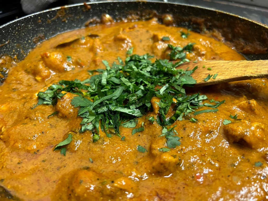 For the curry – 2 tbsp of rapeseed oil, 6 green cardamom pods, 2 star anise, 1 bay leaf, 2 green finger chillies finely diced, 1 scotch bonnet chilli finely diced, 500g / 800g of chicken breasts diced into bite sized pieces, 2 tbsp of white distilled vinegar, 1 tsp of dried fenugreek leaves, good pinch of salt, small handful of chopped fresh coriander, juice of 1/2 a lime.