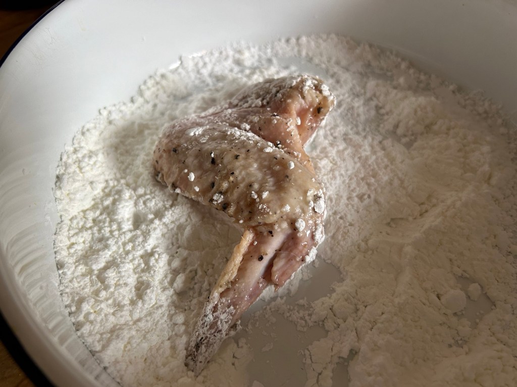 Place the cornflour in a large bowl. Dust the chicken wings in the flour and shake off any excess flour.