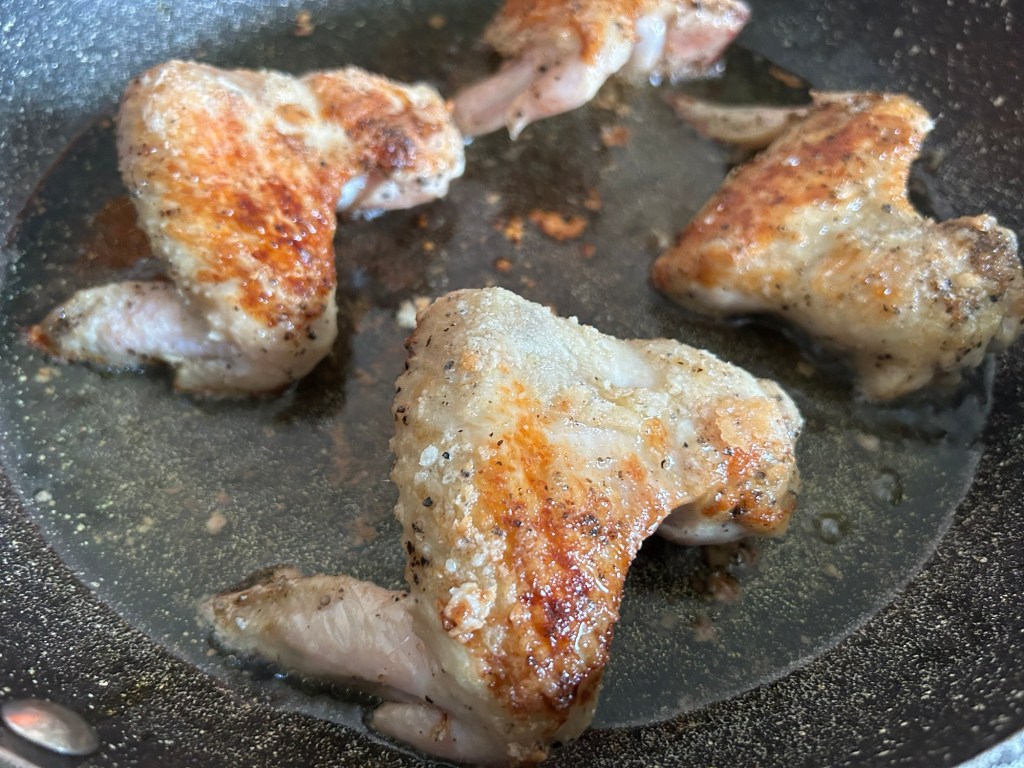 Whilst the chicken is in the oven you can start the sauce using the same pan as you fried the chicken in as there are nice crusty bits in the pan.