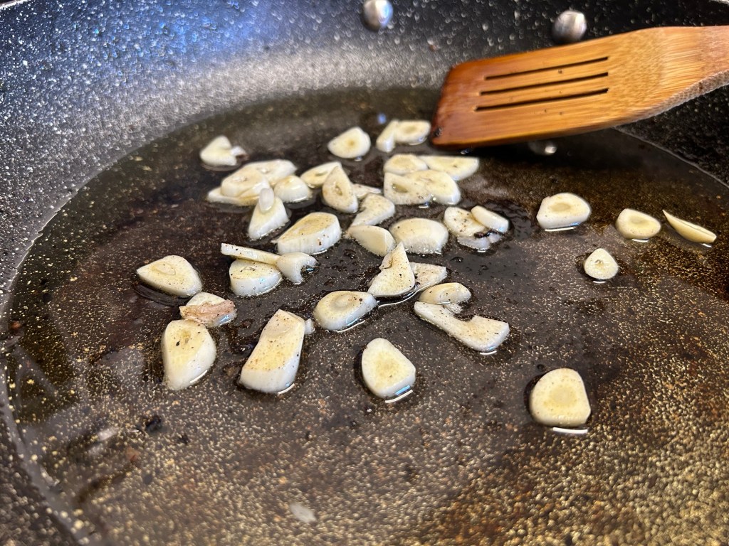 Heat the pan and you might need to add a bit more oil. Once the oil is shimmering add the diced garlic. Fry this off for a couple of minutes but do not burn the garlic as this makes it bitter. Remove from the oil once it’s cooked with a slotted spoon.