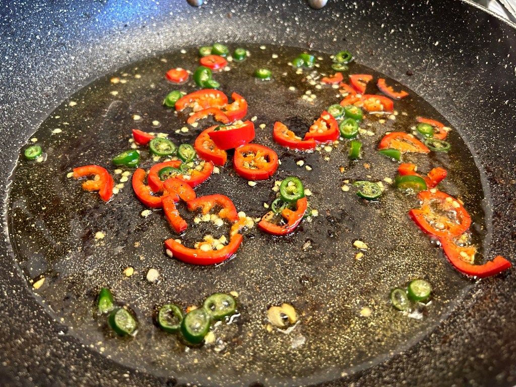 Add to the empty pan the chopped chillies and fry for about a minute.