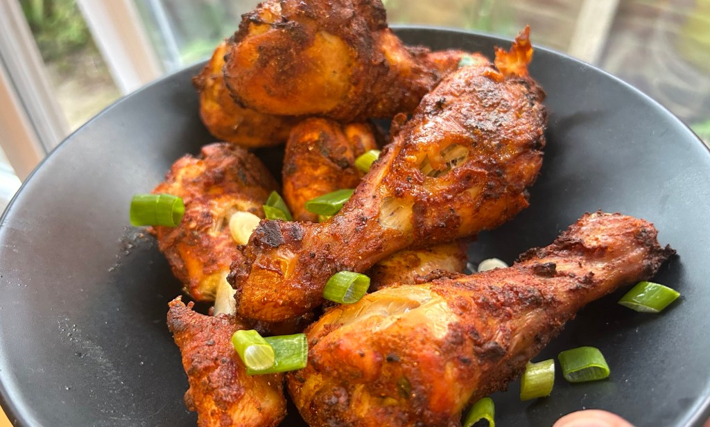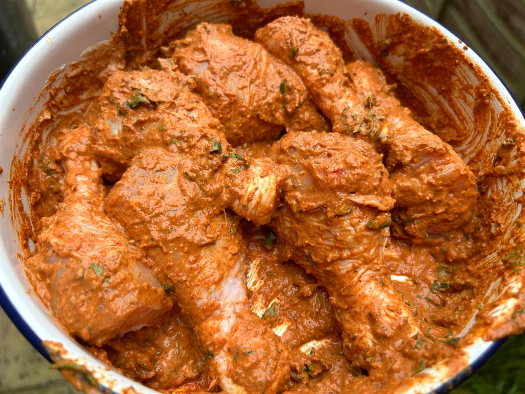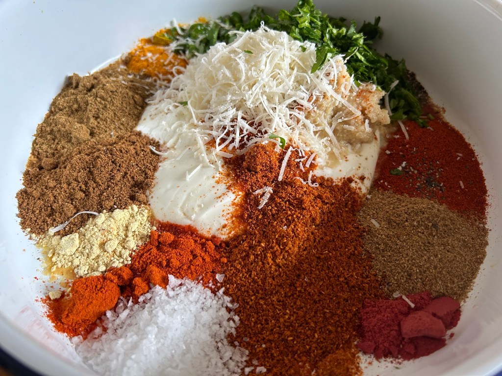 4 large heaped tbsp of natural yogurt, 2 tbsp of garlic & ginger paste, juice of one lemon, 2 green chillies finely diced, 1 tsp of chilli powder, 1/2 tsp of turmeric, 2 tsp of cumin powder, 2 tsp of coriander powder, 1 tsp of garam masala, 2 tsp of salt, 3 tsp of ground black pepper, 2 tbsp of tandoori masala powder, 1 tsp of paprika, 1/2 tsp of fenugreek powder, large handful of chopped coriander, 2 tbsp of grated Parmesan cheese & a pinch of red food colouring.