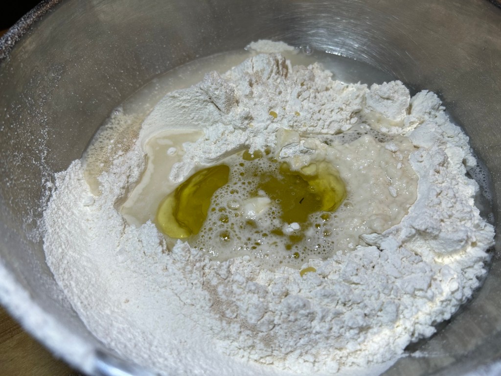 500g of strong white flour, 7g sachet of fast acting yeast (available in all supermarkets in boxes of 6), 275ml of Luke warm water, 60ml of olive oil, 1 tsp of sugar and 1 tsp of salt.