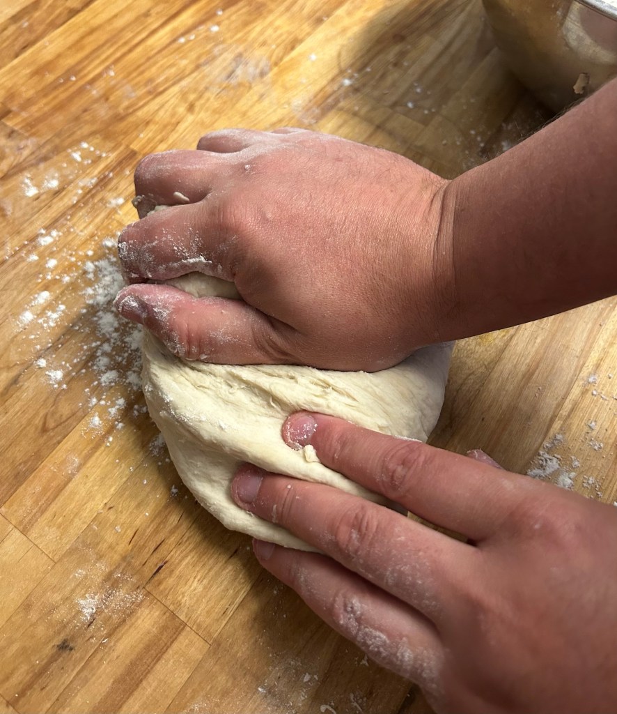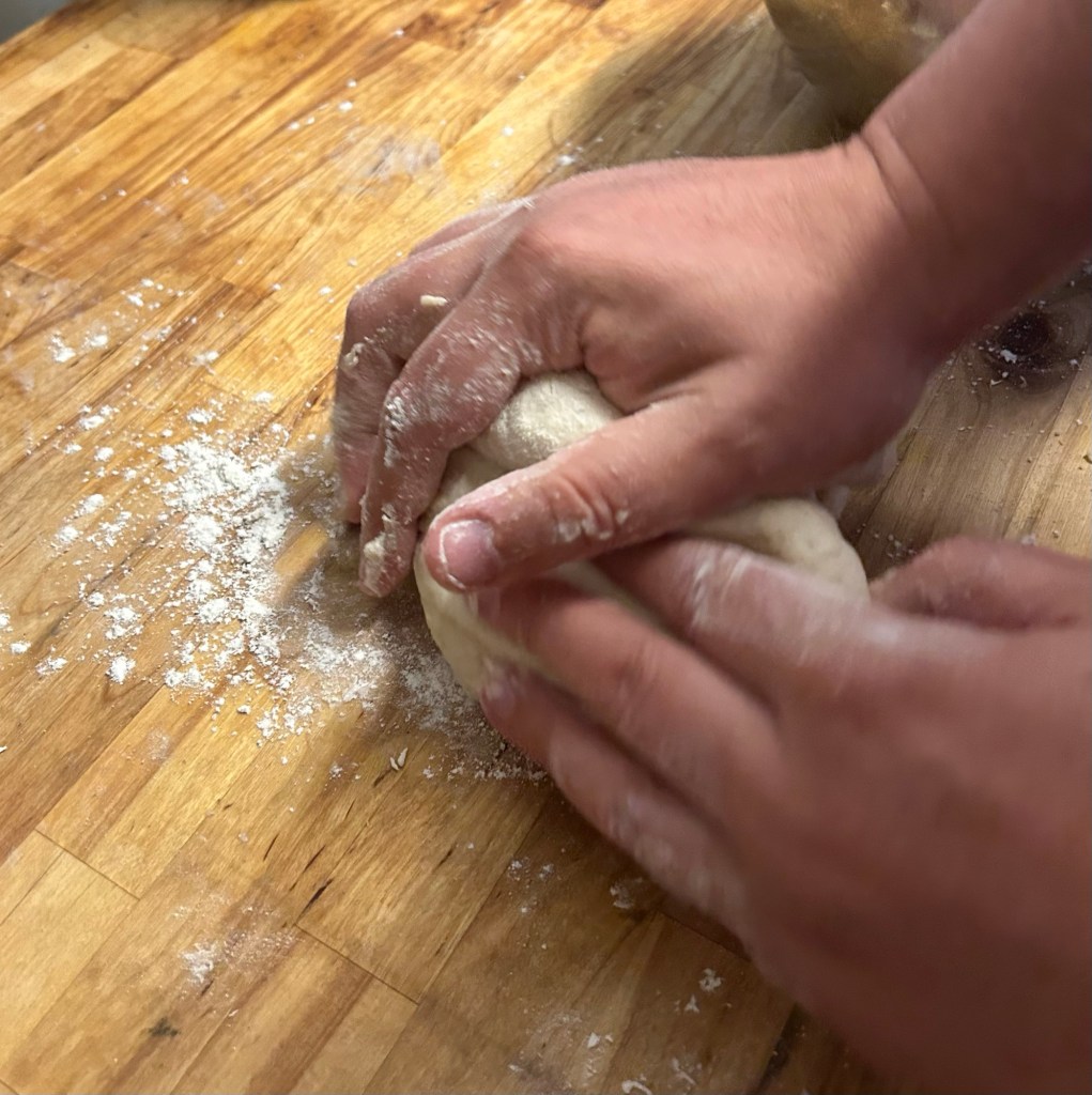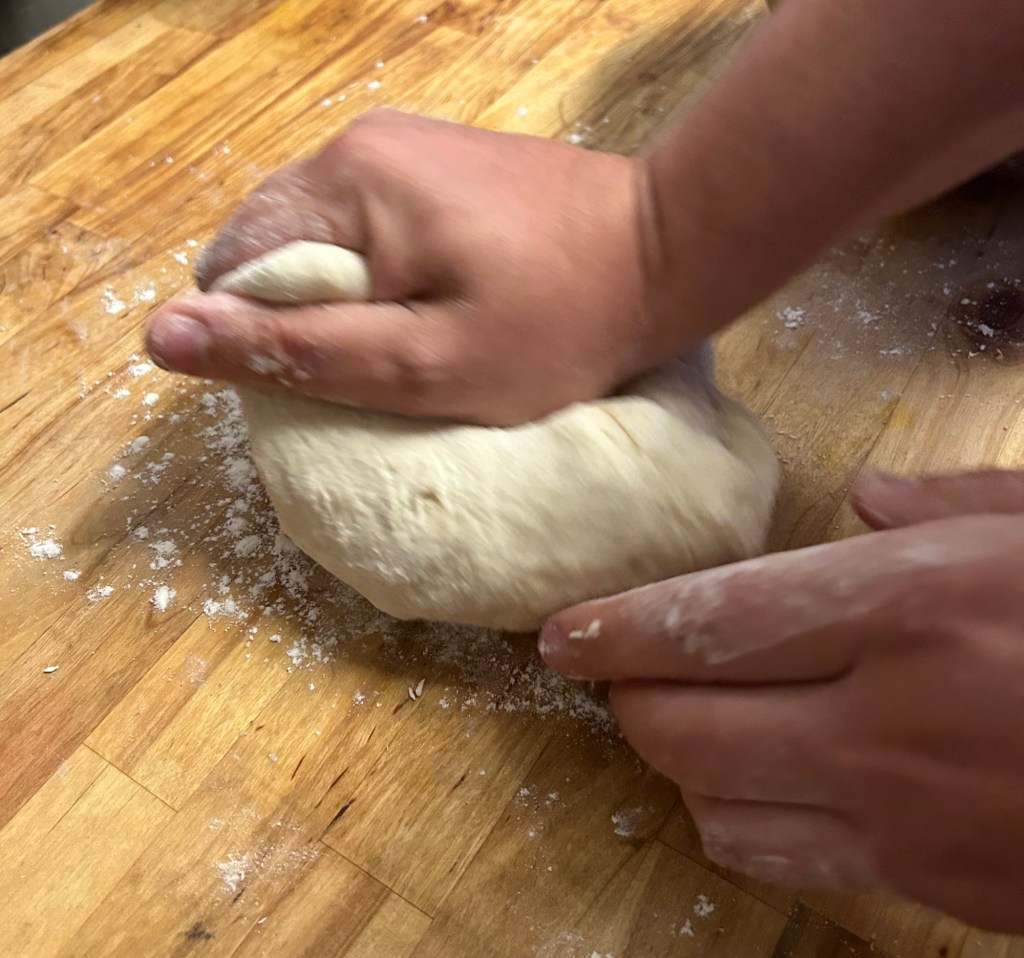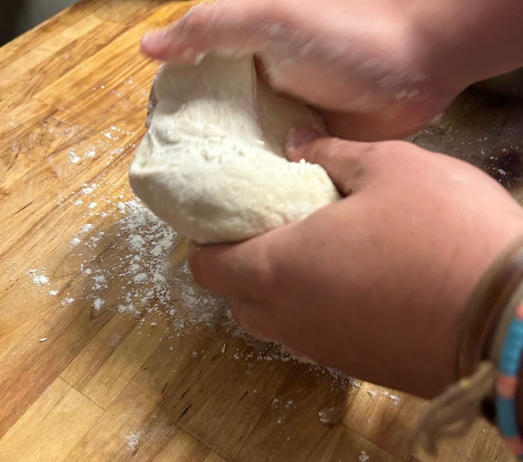 Add some flour to a work surface. Remove the dough from the bowl and start to work it on your surface. You want to warm the yeast and work the flour. You want to work the dough for 5 minutes, back and forth stretching it out and forming the ball.