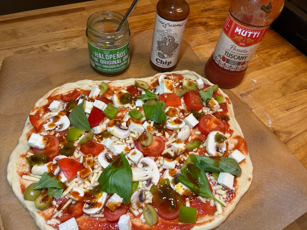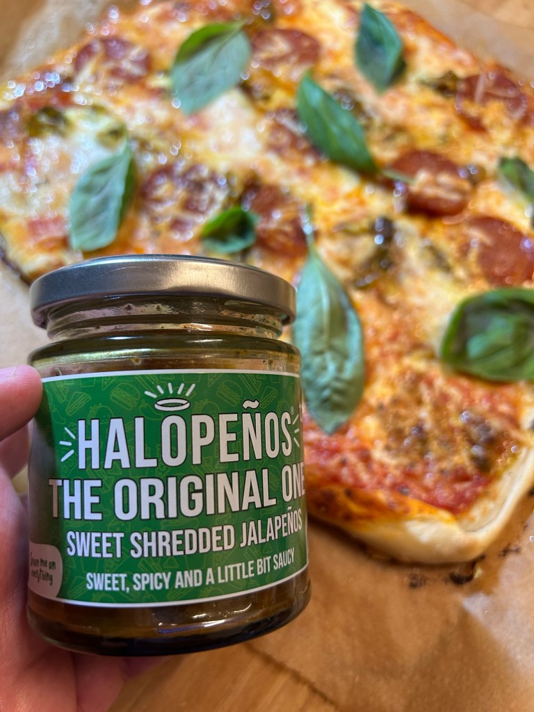 Base of passata, cheese, mozzarella, pepperoni slices, halopenos from a brilliant UK manufacturer and a hot sauce again from a brilliant UK producer called The Lazy Scientist.