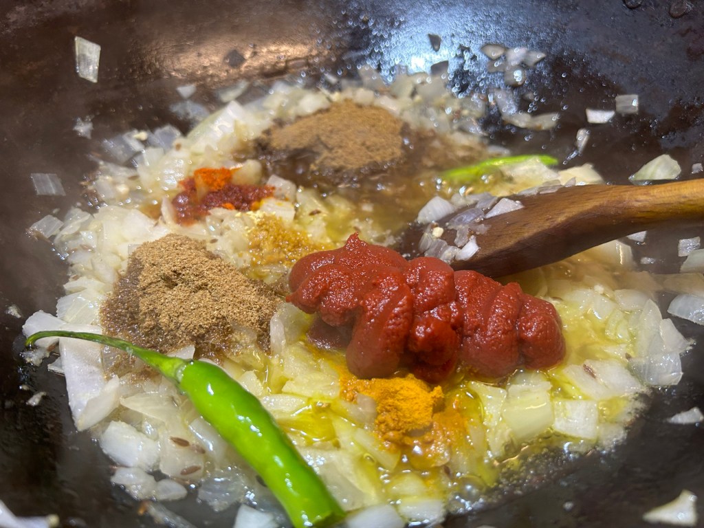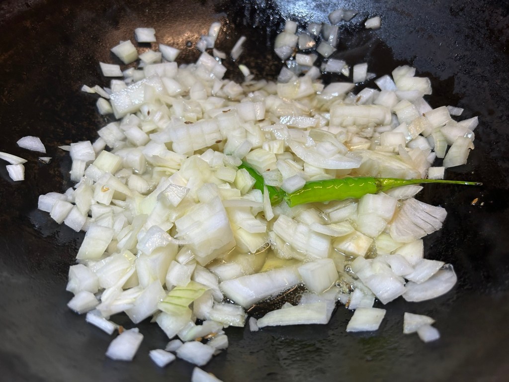 At this point the pan will smell nice and aromatic. Add in the chopped onions & pierced green chilli. Fry off for 3 / 5 minutes until the onions are nice and translucent.