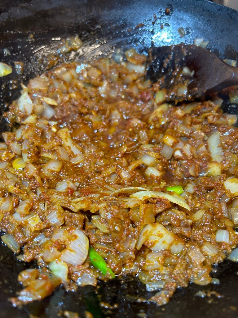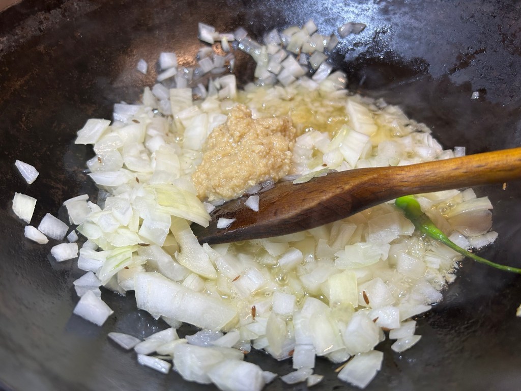Once the onions have changed colour add in the garlic & ginger paste. Stir this in and cook for a further 30 seconds or so.