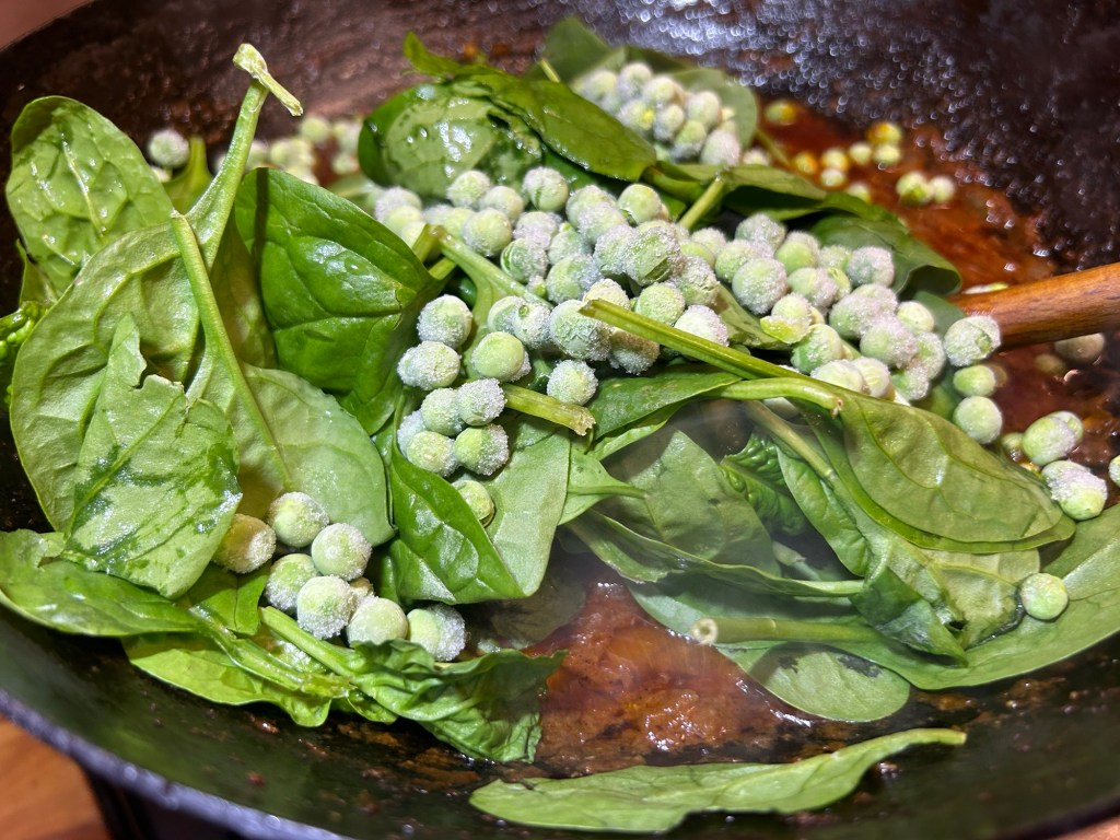 Add in the spinach leaves & frozen peas. Cook for a further 3 minutes until the spinach has stopped thinking it’s the hardest leaf on the planet and wilted down into the sauce.