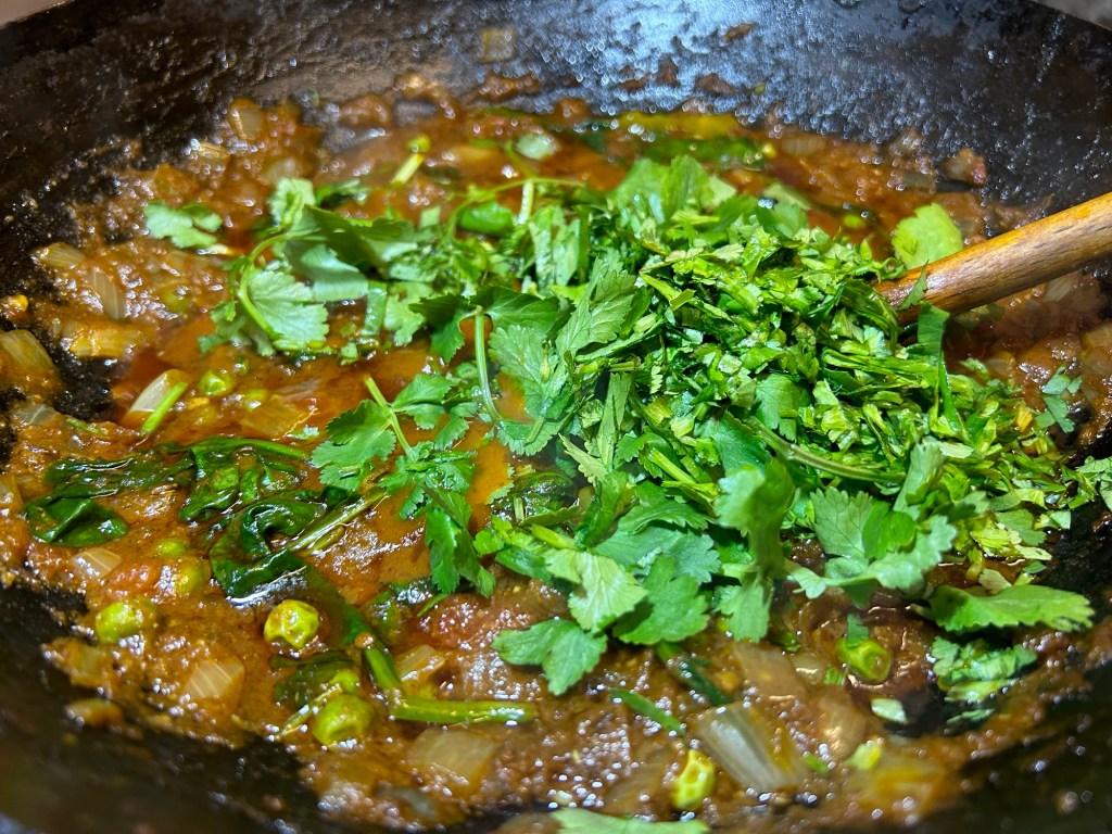 Once the spinach has wilted add in the coriander………….
